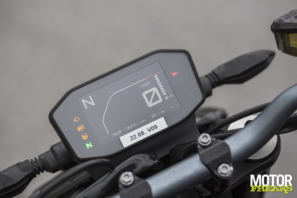 De uitgebreide lijst rijdershulpjes van de 790 Duke omvat drie verschillende rijmodi – Sport, Street en Rain – plus meerstanden MTC tractiecontrole, Bosch bochten-ABS dat hellingshoekafhankelijk reageert en KTM’s gevestigde MSR / Motor Slip Regulation waarbij de Keihin ECU de mate van motorrem naar het achterwiel regelt. Het elektronicapakket zou best weleens de benchmark kunnen worden in deze middenklasse, met naast het eerdergenoemde een quickshifter met autoblipper, launch control en een wielspin regelaar, evenals een anti-wheelie programma dat uitschakelbaar is voor diegenen die al stuntend naar het volgende stoplicht willen gaan. Aan het andere eind van de schaal zal er ook een A2-vriendelijke performance versie op de markt worden gezet.