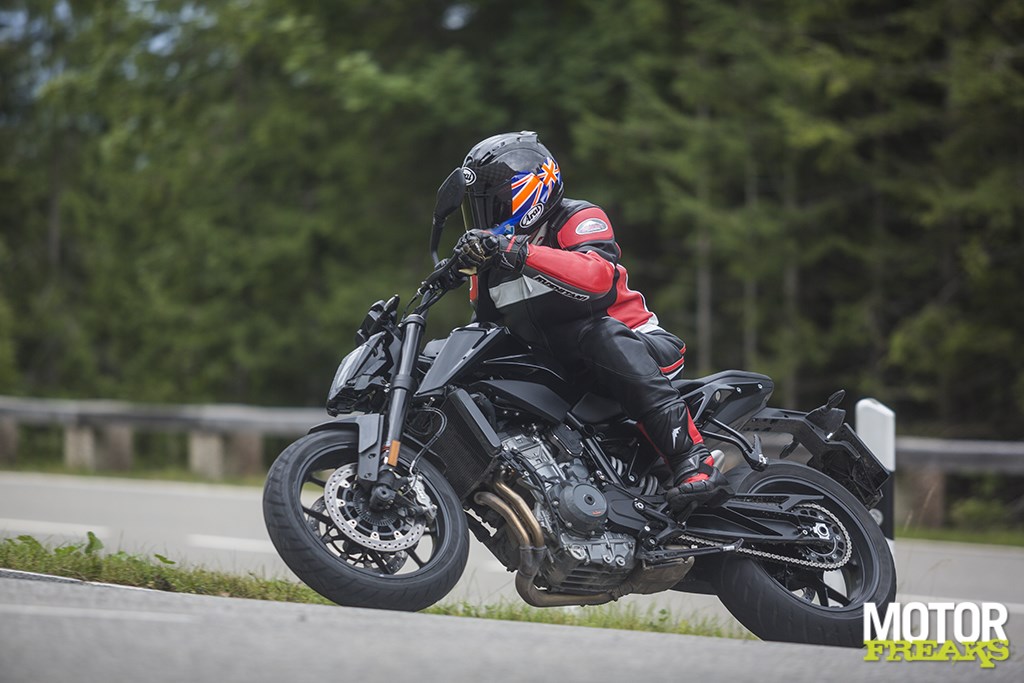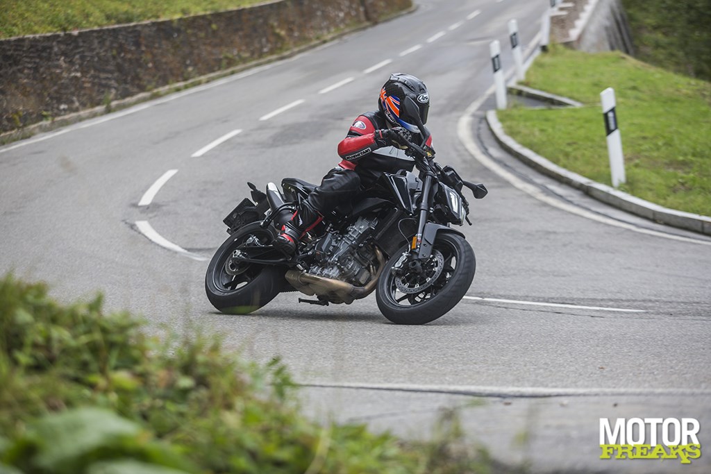 Vergeleken met z’n concurrentie op de markt is de Oostenrijkse paralleltwin inderdaad een tweecilinder die denkt dat ‘ie een eencilinder is, waar bijvoorbeeld een motor als de BMW F800R veel meer als een halve viercilinder aanvoelt. Je zult zelfs goed moeten kijken om te zien dat voor een tweecilinder en geen eencilinder staat, een gevoel dat wanneer je hard gaat rijden nog eens wordt versterkt. De 790 Duke voelt namelijk zo licht en wendbaar over de bochtige bergwegen, waar hij met gemak van het ene op het andere oor te leggen is, ondanks dat KTM ervoor heeft gekozen de krukas niet tegengesteld te laten roteren, Dat Taiwanese Maxxis rubber is nog geeneens zo slecht. Net als die 790 Duke trouwenswaardoor het gyroscopisch effect van het motorblok het sturen in theorie iets zwaarder zou moeten maken. Wat dus duidelijk niet zo is. Een tegengesteld roterende krukas, zoals in de MotoGP gebruikelijk is en ook door MV Agusta in de driecilinder wordt toegepast, is voor KTM geen optie geweest, omdat dat weer een extra as met tandwiel (en daarmee meer roterende massa en extra gewicht) om de rotatie van de krukas weer om te draaien zou hebben gekost. De 180/55 ZR17” Maxxis achterband heeft eveneens het sturen wat zwaarder gemaakt – KTM wilde hier per se breed gaan – en opmerkelijk genoeg is de fiets standaard ook nog eens met een stuurdemper uitgerust, wat me doet afvragen of in de zoektocht naar lichtvoetig stuurgedrag KTM voor een radicale geometrie heeft gekozen.