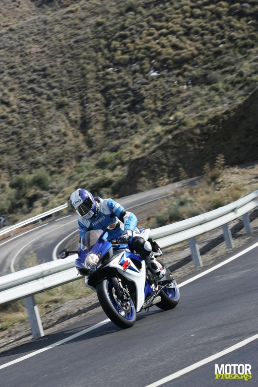 Hadden we al gezegd dat het ijs- en ijskoud was in Almeria? Bij deze: tijdens de sneak preview was het koud in Almeria, meer dan een paar graden boven nul was het niet en dat zijn geen fijne temperaturen om hard te remmen cq. accelereren, laat staan extreme hellingshoeken aan te nemen. De onverwachte sneeuwval maakte dat de van oorsprong 200 kilometer lange tocht behoorlijk moest worden ingekort. Dat en het feit dat ze ons met onderkoelingsverschijnselen waarschijnlijk al na 50 kilometer af hadden kunnen voeren. Natuurlijk, ik hoor je al denken: "Watje, zou koud is twee graden boven nul toch niet?" Met een Ruka allweather outfit niet nee, maar in je raceoverall met zomerhandschoenen wordt het ineens een heel ander verhaal. Afijn, terug naar de route die voor een groot gedeelte nat was geregend. Het asfalt was - net als ondergetekende - koud, maar dat mocht de pret niet drukken. Ik zat per slot van rekening in het normaal gesproken altijd zonnige Spanje op de Suzuki GSX-R600, en dat nog voor de officiele launch eind deze maand.
