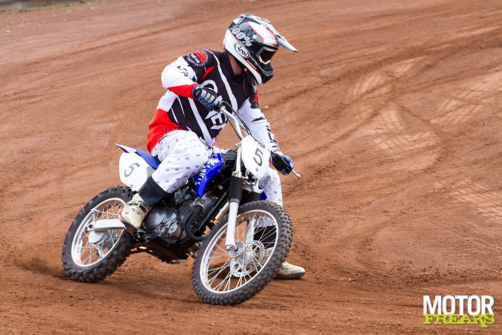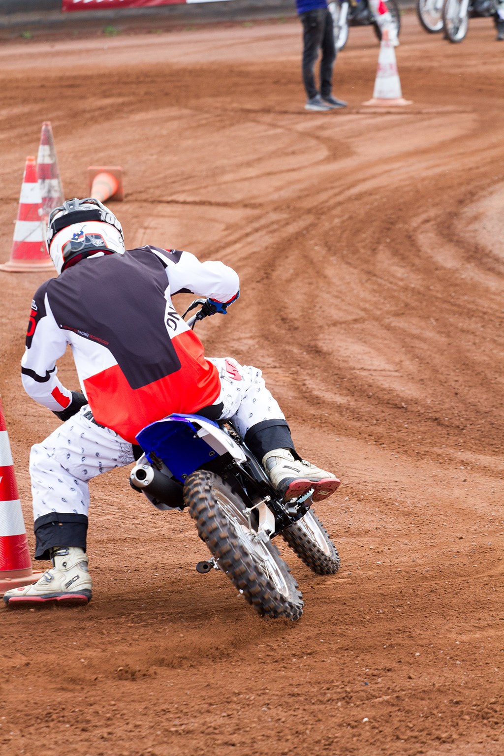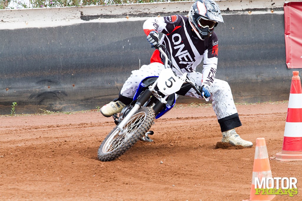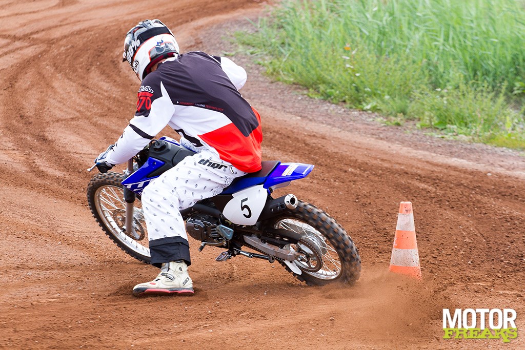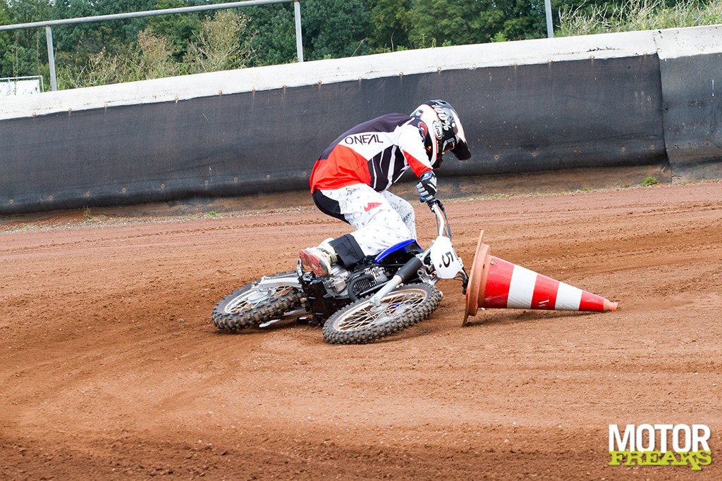 Nu vinden we dat ergens wel vreemd, want bij elke Flat track of Dirttrack training wordt er altijd juist op gehamerd om je linkerbeen zo dicht mogelijk naast de motor te houden, als ‘derde wiel’, maar er zijn een paar verschillen. Te weten het gebrek aan vermogen om te driften, het gebrek aan gewicht van de motor, het overschot aan grip van de banden en het ontbreken van de stalen ‘slof’ die het mogelijk maakt netjes te glijden met de linkerpoot. We moeten driften leren, dus we moeten behelpen. Blijkbaar is dit de manier om dat voor elkaar te krijgen, want uiteindelijk werkt het; de Yamaha draait ineens heel kort af, ik schop de pilon aan de binnenzijde omver terwijl ik een tel daarvoor nog dacht er veel te snel langs te schieten om überhaupt de bocht nog te kunnen halen.
