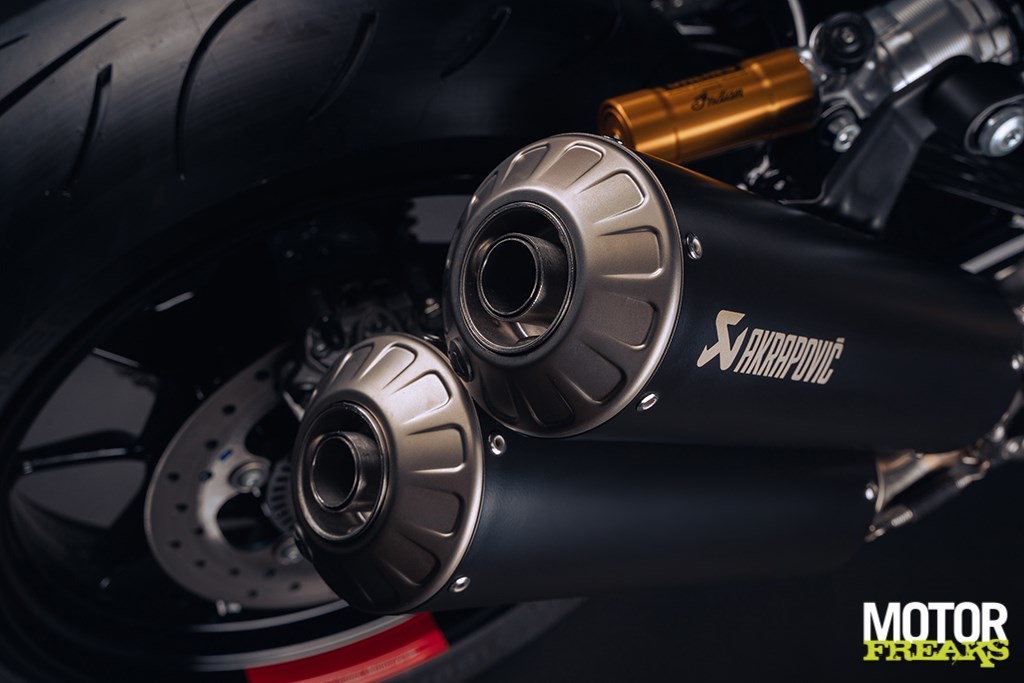 Ook de Akrapovic dubbele einddemper heeft een zwarte afwerking gekregen, net als alle carbonfiber onderdelen rond het blok - de motorcovers, het hitteschild van de uitlaat en de kettingbeschermer. En zoals gezegd de wielen, die fraaie rode contrasterende accenten hebben gekregen.
