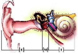 2. Het middenoor met trommelvlies en de middenoorbeentjes, hamer, aambeeld en stijgbeugel; in de figuur aangegeven met "M". Het middenoor is met lucht gevuld via de buis van Eustachius.
