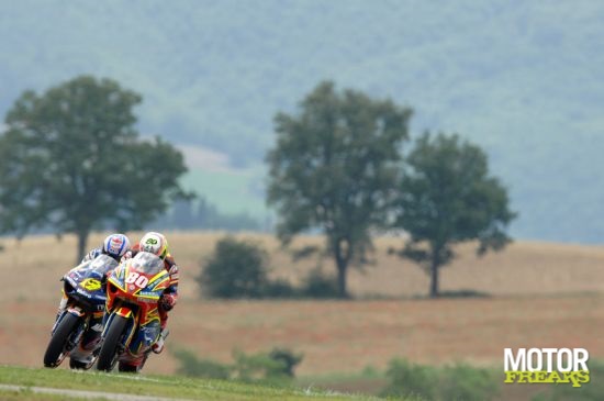 Na een handvol Aprilia"s (en een Gilera, maar dat is eigenlijk ook een Aprilia) wist Andrea Dovizioso een achtste tijd te realiseren, Anthony West kwam tot een tiende tijd. De afsluitende tweede kwalificatie begon op een opdrogende baan, maar ook nu kwam tijdens de training de regen uit de Italiaanse hemel. Hierdoor werden de tijden niet meer verbeterd en "grootste" slachtoffer was Jorge Lorenzo. Hij kwam door een slechte planning niet verder dan een twintigste trainingstijd en moest in de race aan de bak. Na de Angelis op vrijdag pakte nu Bautista de snelste tijd en daarmee de poleposotie, zijn eerste. Dovizioso maakte daar gebruik van door in de slipstream van Bautista een tweede tijd op de klokken te zetten. De eerste rij werd verder gevuld met Shuhei Aoyama en Thomas Lüthi. Anthony West viel met een negende tijd wat tegen.