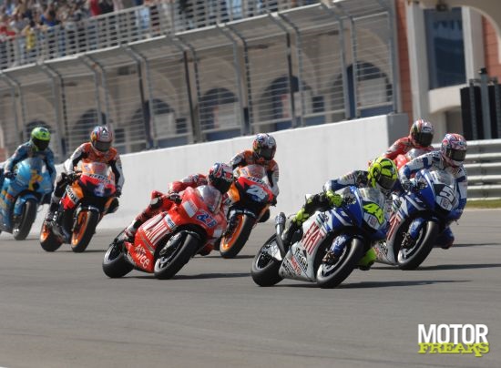 | Start van de MotoGP met Rossi, Edwards, Capirossi (verscholen), Stoner, Pedrosa, Hayden en Vermeulen. |