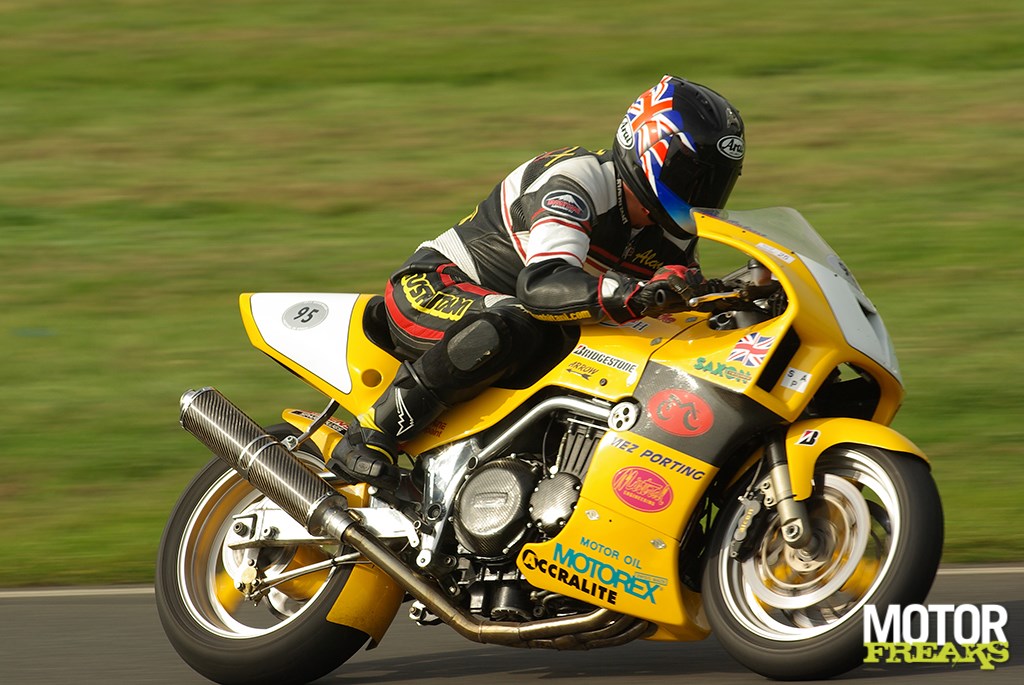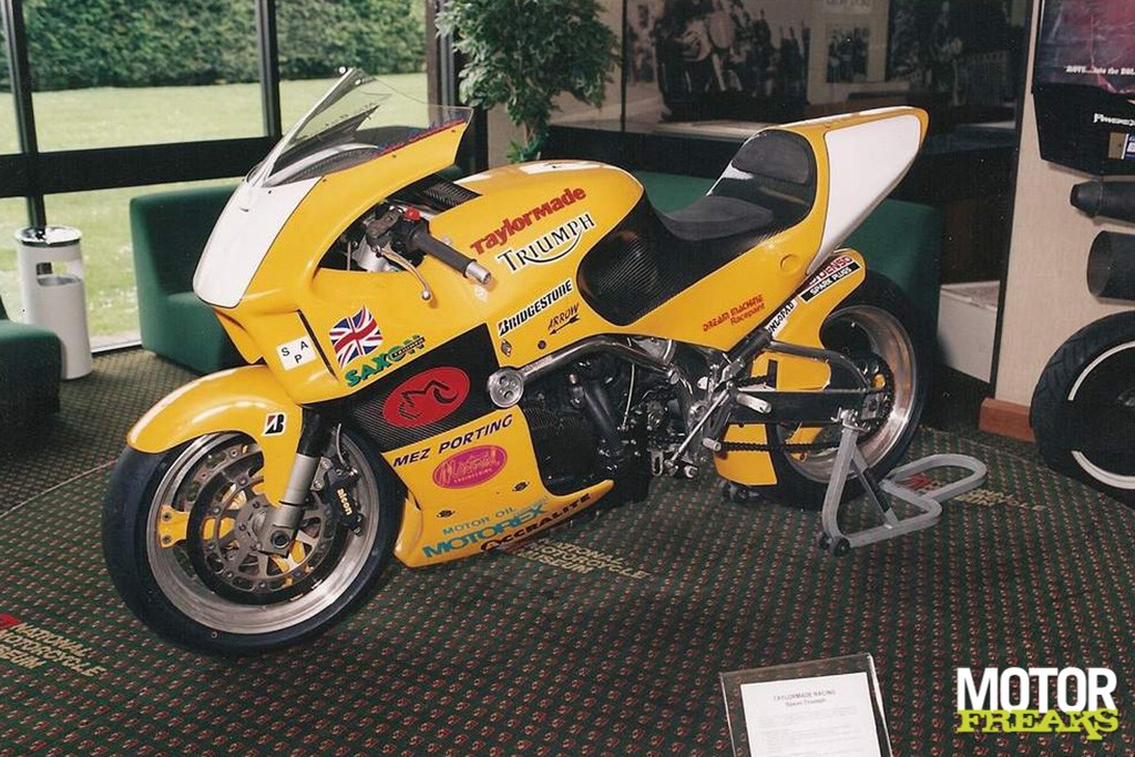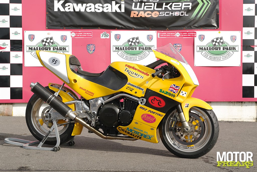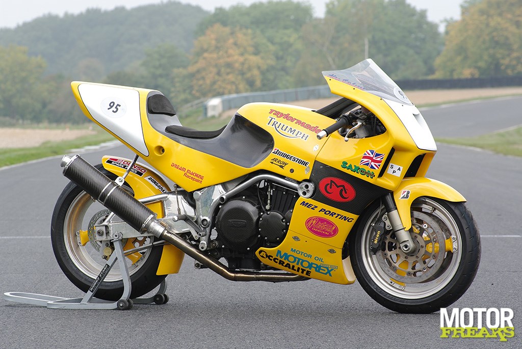 De Saxon Triumph had een set 39mm FCR Keihin flatslide carburateurs, plus een speciaal ontwikkelde Motad uitlaat die de 105 dB geluidslimiet van de FIM passeerde zonder afbreuk te doen aan het heerlijke huilende motorgeluid van een race-triple, een van de meest emotionele geluiden op twee wielen. Van een aanvankelijke 115 pk bij 9.500 tpm in de straatlegale Super III-uitvoering van 885 cc (vergeleken met 98 pk bij 9.000 tpm voor andere vroege 900-triples) werd het resultaat progressief ontwikkeld tot 133 pk bij 10.200 tpm aan het achterwiel tegen de tijd dat de motor voor het eerst het circuit op ging op Mallory Park, precies 30 jaar geleden in april 1994.