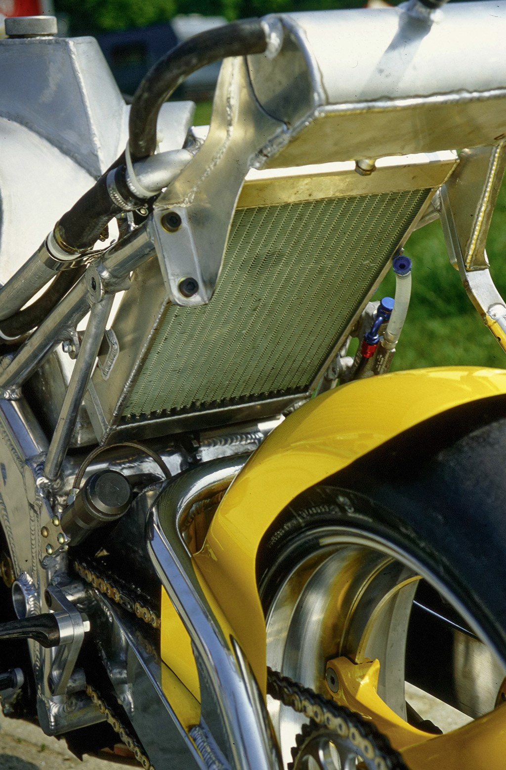 Maar daar hield de innovatie niet op, want de stroomlijn van de Saxon, die later door John McQuilliam van CMC werd gemaakt van volledig versterkt koolstofvezel, had interne kanalen die de luchtstroom niet alleen naar het gewenste doel leidden, maar ook scheidden terwijl ze dat deden. Om het volumineuze Triumph-motorblok zo ver mogelijk naar voren te kunnen plaatsen en zo de gewichtsverdeling naar voren te vergroten tot 53/47% (geen buiging in de voorvork, weet je nog?), monteerde Nigel Hill, net als zijn Kiwi-tegenhanger John Britten, de koelradiateur onder het zadel - een formaat dat later werd gekopieerd op de Modenas/Proton 500 GP-driecilinder van Kenny Roberts en door de Engels-Italiaanse ontwerper Adrian Morton op zijn Benelli Tornado 900 driecilinder.