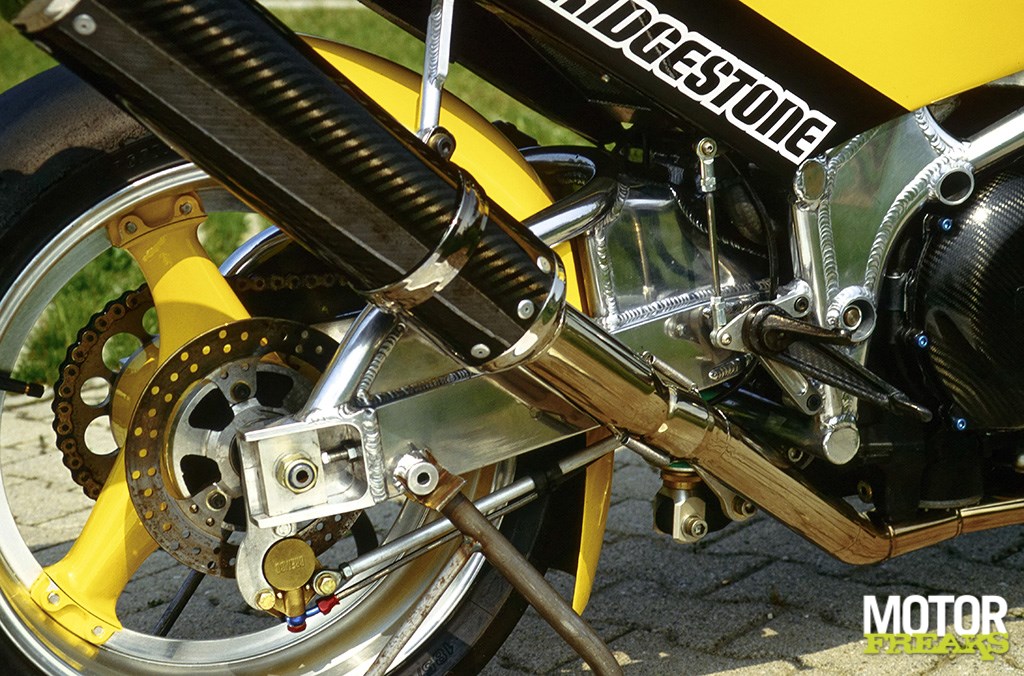 Heb je dat gehoord van die Britten? Die voorwielophanging brak af tijdens de shake-down test. Denk je dat dit wel heel blijft Paul?achterwiel (magnesium midden, gesponnen lichtmetalen velg) met 5,50 inch te smal voor Bridgestone's nieuwe 190/640-17 Superbike-achterwiel, dus waren we gedwongen om een band met een kleinere sectie te gebruiken, met minder zijdelingse grip.