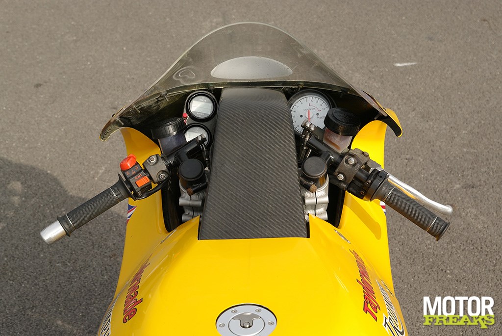 Ons raceprogramma bewees dat deze torsiestijve structuur de motorfiets zeer stabiel maakt tijdens het remmen en het nemen van bochten, en dat de scheiding tussen het stuur en de vering veel eenvoudiger en rationeler is dan bij een naafbesturingssysteem zoals de Bimota Tesi of ELF. Dit betekent dat je een betere feedback van de voorband krijgt dan met een van deze vergelijkbare ontwerpen, maar dat je nog steeds diep in de bocht kunt remmen zonder bang te hoeven zijn dat de vering vastloopt en je de voorkant verliest - wat, zoals ik al snel merkte tijdens het racen met de motor, je in staat stelt om later harder te