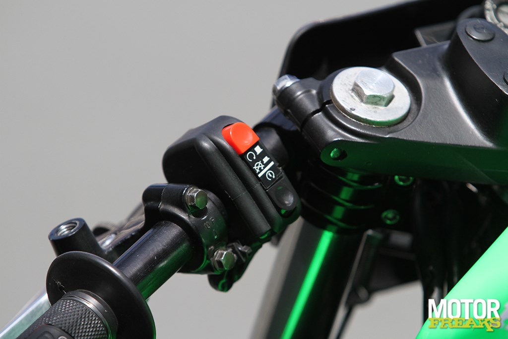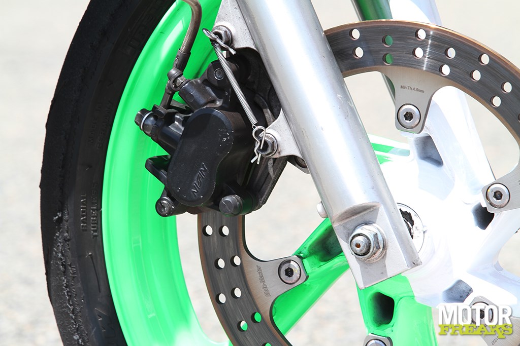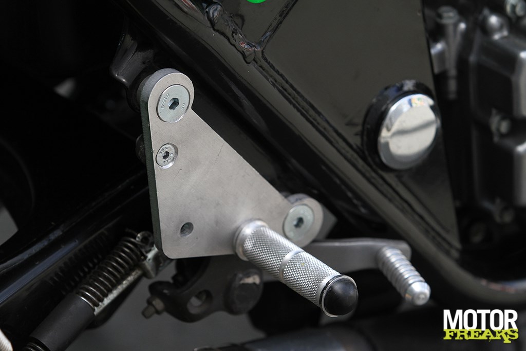 Voetsteunen zijn een must voor de grondspeling. Nissin 2-zuiger remklauw is beter dan de Brembo van de volgende generatie, maar de kunst blijft natuurlijk om vooral niet te remmen