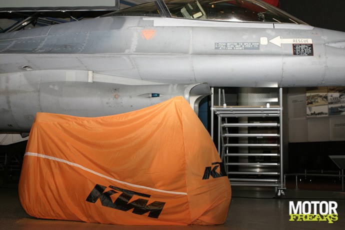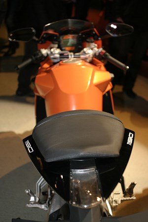 ideale positionering op het voertuig. De motor is op élke denkbare manier verstelbaar. Heeft in eerste instantie in verhouding een diepere zit, wat maakt dat je niet volledig plat op die motor hoéft te zitten, maar... het kan echter wel. Wil je echt 'face down, arse up' racen? Kwestie van een paar boutjes; voetsteunen omhoog; rem-en schakelpook aanpassen, zitunit omhoog... voor het mooie nog even de duozit weg, duosteps op de plank naast de spiegels en klaar. Aan KTM's instelling zal het niet liggen; bekijk alleen al de stoute promofilm en je weet dat je met een hooliganmerk bij uitstek te maken hebt.