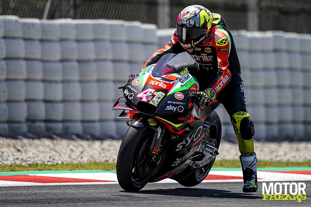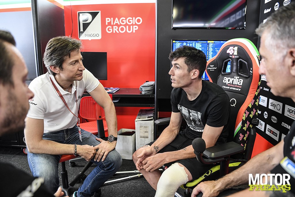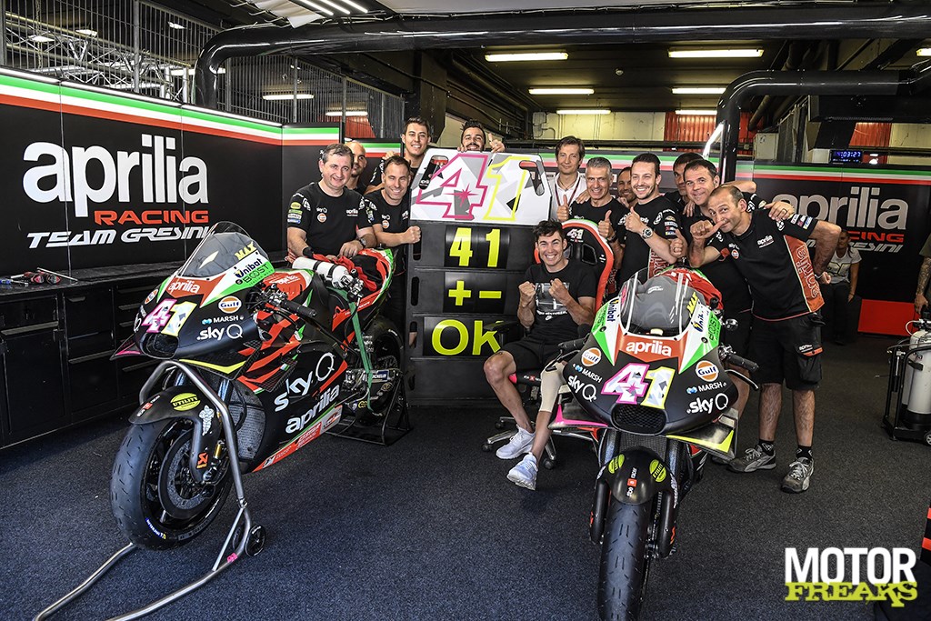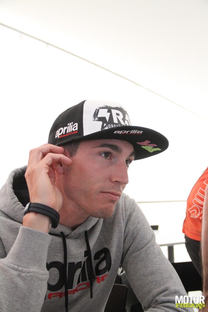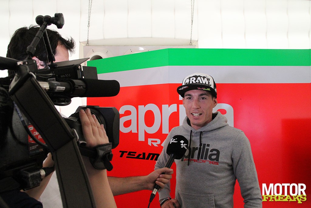 Haha, dat is een goeie. Ik denk dat ‘m dat in de houding zit. Het belangrijkste is je houding. Hard werken en nooit opgeven. Bij ons in Spanje zeggen ze dat het gras altijd groener is aan de overkant, dus is het soms beter om niet naar die overkant te kijken. Niet kijken naar die andere motoren, maar focussen op wat je hebt. Toen ik voor Aprilia tekende was mijn doel om Aprilia op het podium te zetten en ik geef niet op. Ik geef mijn uiterste om de motor te verbeteren. Soms is het frustrerend, dan voel ik dat ik goed rijd en voor het podium kan vechten, maar we moeten de motor verbeteren. Aprilia heeft mij ook nodig om de motor te verbeteren.
