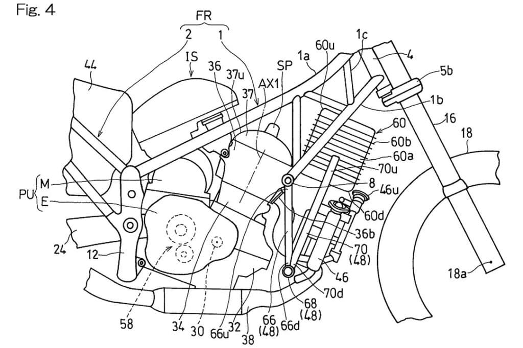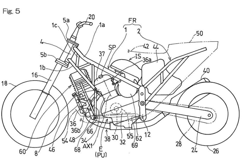 In het nieuwe patent is het vakwerkbuisframe aan de voorzijde verlengd, waardoor het balhoofd verder naar voren komt te liggen. De radiator van de bekende 451cc paralleltwin (hetzelfde blok als in de huidige hybrides) verhuist omlaag. Daardoor ontstaat ruimte vóór de cilinderkop voor de accu, die daar in een vergrote en beter geventileerde omgeving kan worden geplaatst.