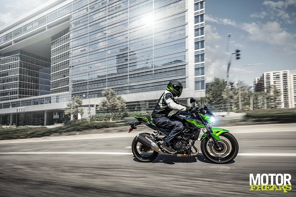 De Z400 wordt aangedreven door dezelfde 399cc paralleltwin als de Ninja 400, die dit jaar het WK Supersport 300 heeft gedomineerd en met Ana Carresco de eerste vrouwelijke wereldkampioen heeft opgeleverd. Het blok wordt opgegeven voor een topvermogen van 45 pk, wat - zo weten we van de Ninja - meer dan genoeg om ook op 130 km wegen je rijbewijs in te mogen leveren. Een slip-assist zorgt en voor een lichte bediening van de koppeling, en voor een niet-blokkerend achterwiel bij te rap terugschakelen.