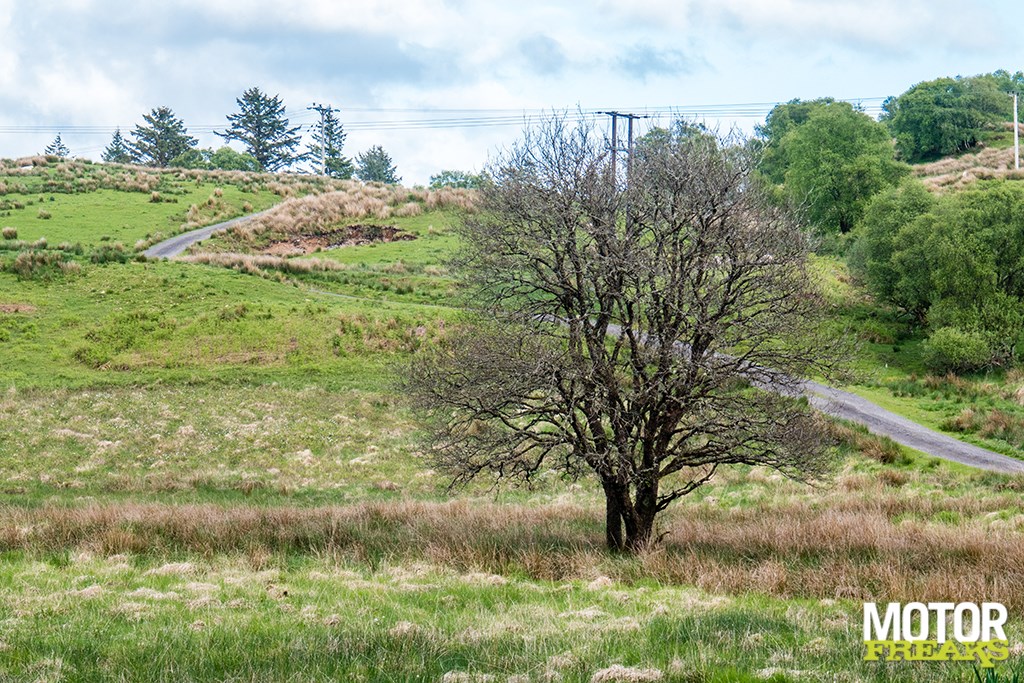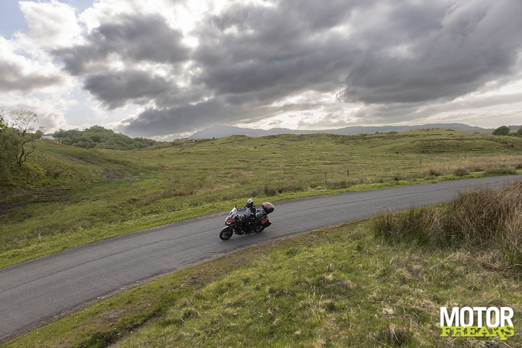 met mooie ronde bergen. Af en toe komen we door kleine dorpjes met mooie, natuurstenen kerkjes en dito bruggetjes. Je zou er zo een opname van Midsummer Murders op kunnen nemen. Het is er leuk rijden, het traject is enorm bochtig en met de Versys zwier je daar lekker vlot doorheen. Moet ook wel, want we hebben vandaag nogal een afstand af te leggen: 124 mijl oftewel 198 km. Dat lijkt niet veel, maar als je er – door vertragingen bij vluchten naar Edinburg – pas om half drie aan begint en je voor driekwart over bochtige bergwegen rijdt, dan is het best wel een uitdaging.