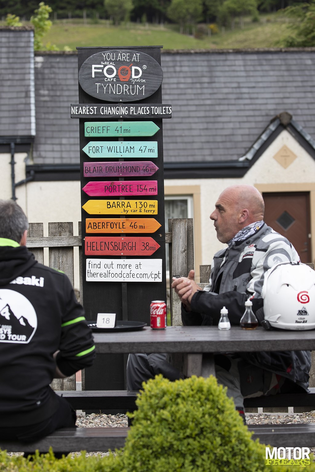 Koffiestop in Tyndrum. Je kunt hier ook goed wandelen, maar niet op motorlaarzen (li) Koffie, goed voedsel ja. Wifi... is hier een zeldzaamheid (mi) Gelukkig spreken ze ook Engels (re)