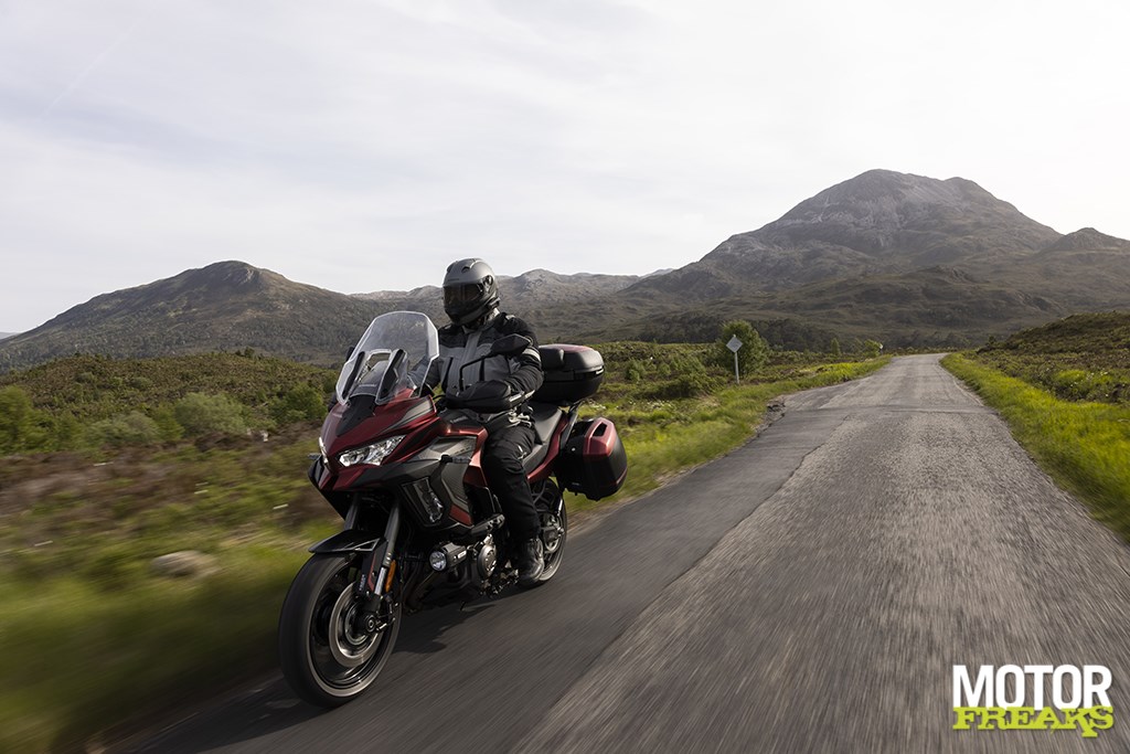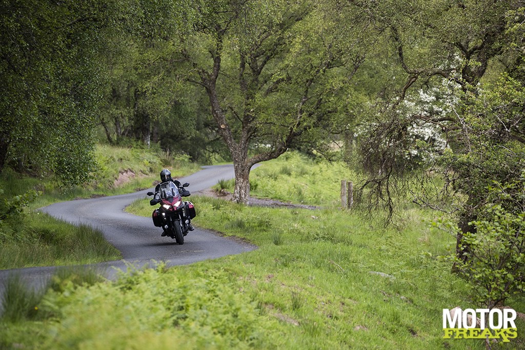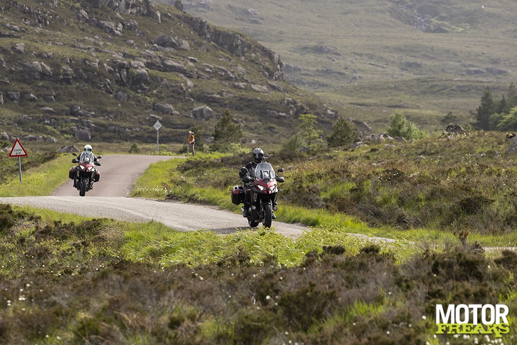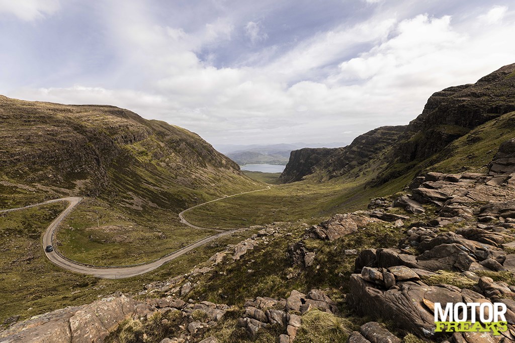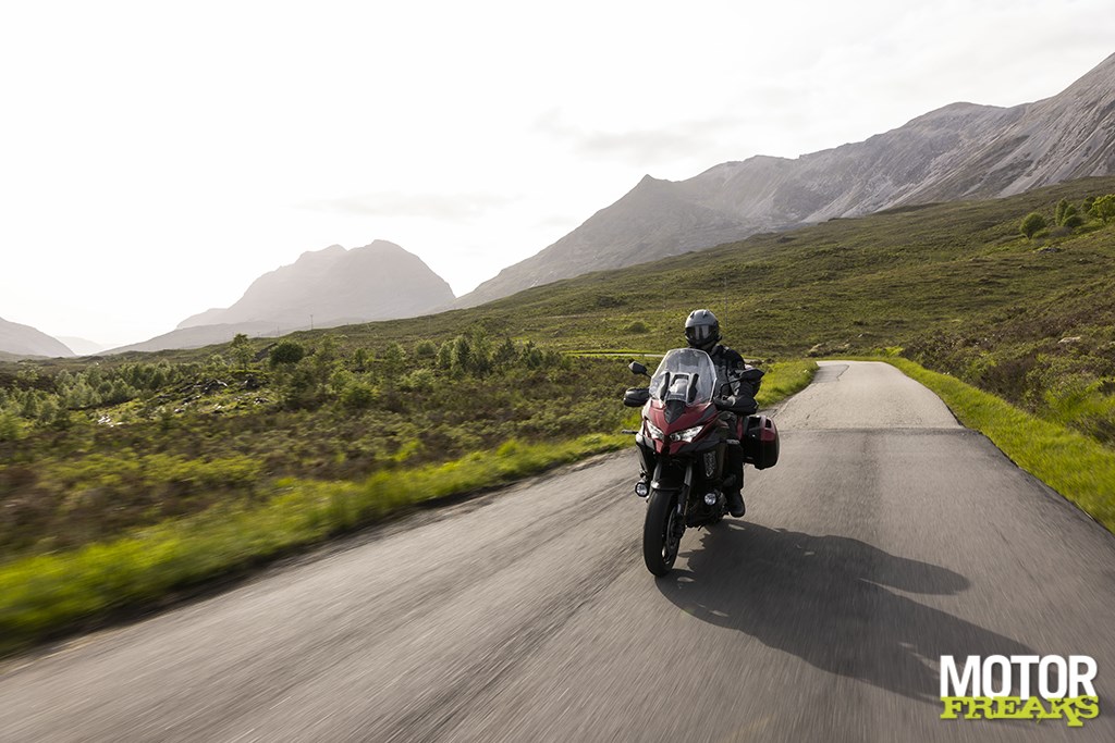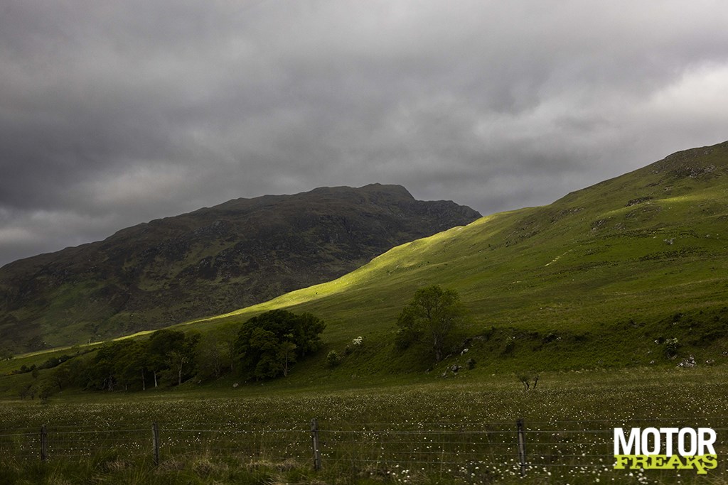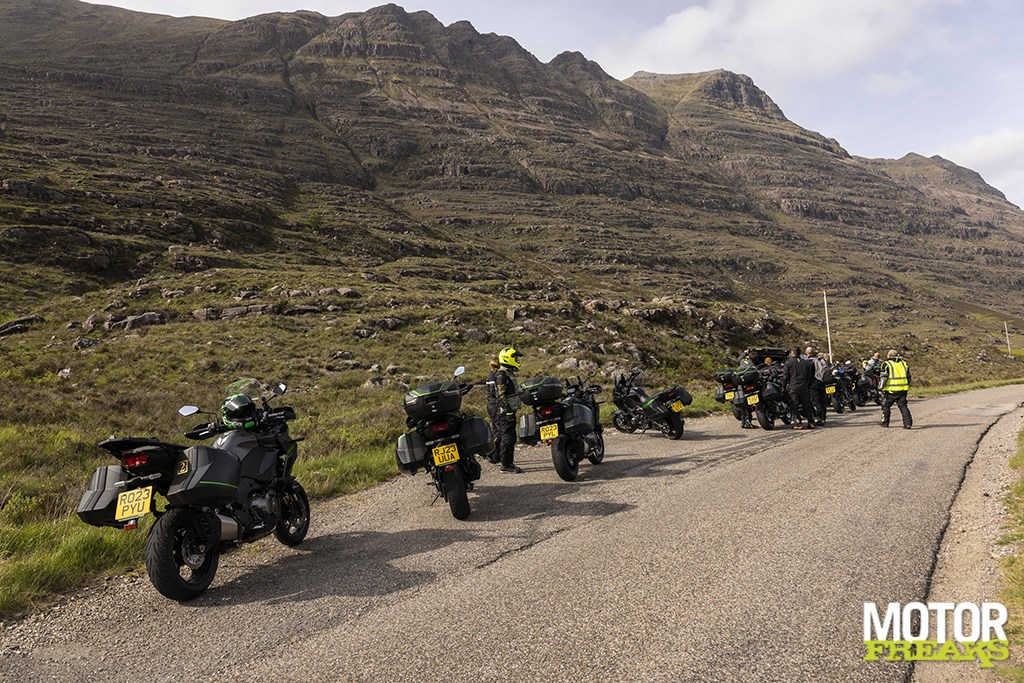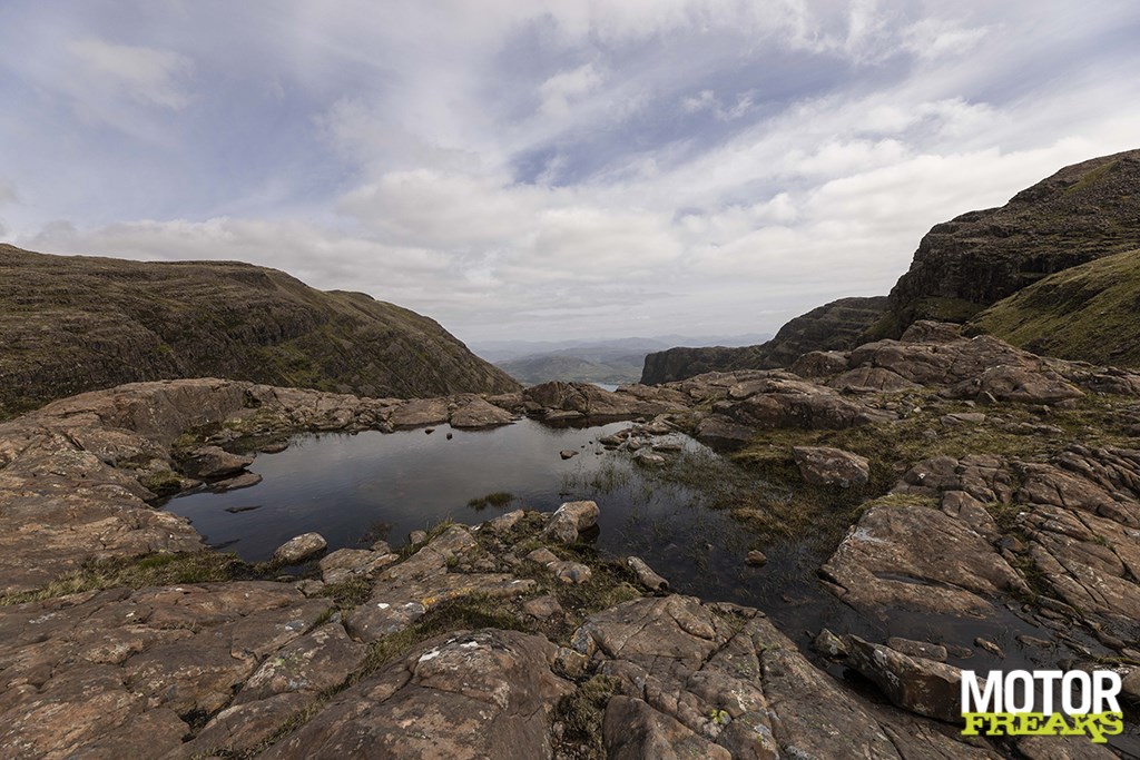 De zon weet zich inmiddels door het wolkendek te branden. De handvatverwarming is al even uit, de winterhandschoenen hebben plaats gemaakt voor dunnere zomerexemplaren als we na Strathcaron over steeds kleinere wegen en paadjes door een steeds kaler wordende bergvallei omhoog rijden over de Bealach na Bà. Het is een iconische single-track weg in de Highlands. Bochtig en prachtig, bijna als een Alpenpas. Overal zie je kleine bergstroompjes over keien naar beneden kabbelen, tussen het wat mossige gras. Dan rijden we tegen een muur aan: een groene bergwand met een paar haarspeldbochten waar je “u” tegen zegt: de “Pass of the Cattle”. De Versys is met 257 kg niet de lichtste Adventure-machine en de koffers met bagage voegen daar nog wat aan toe, toch krijg ik
