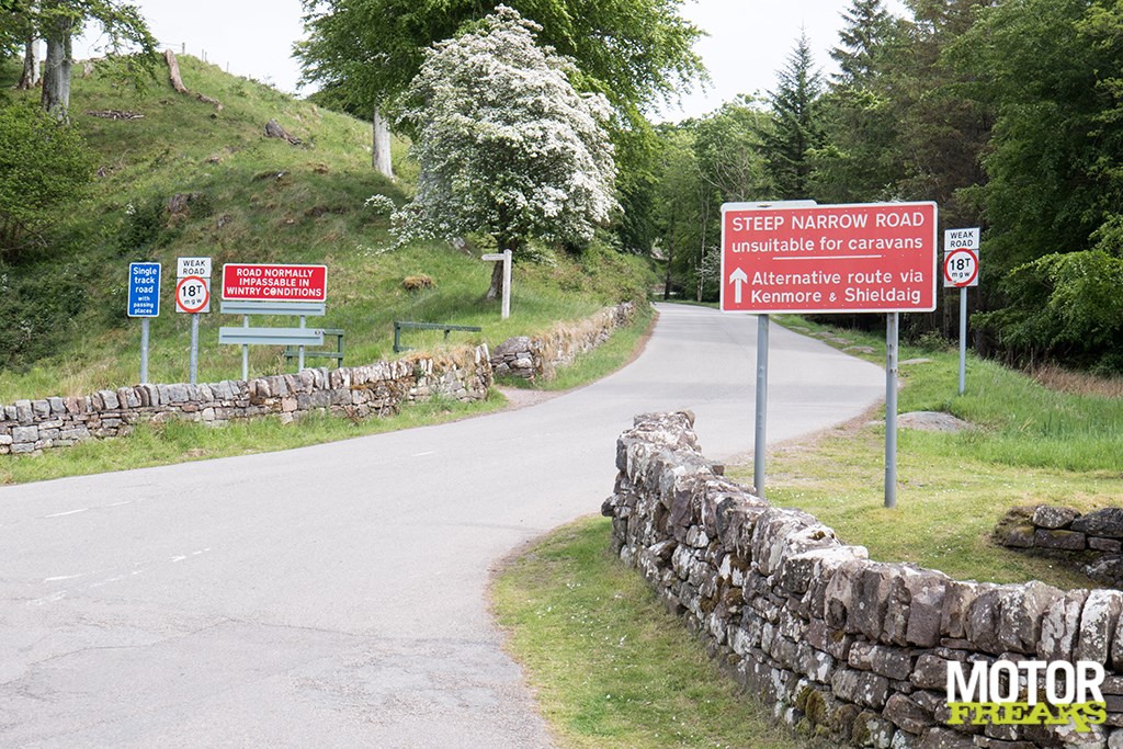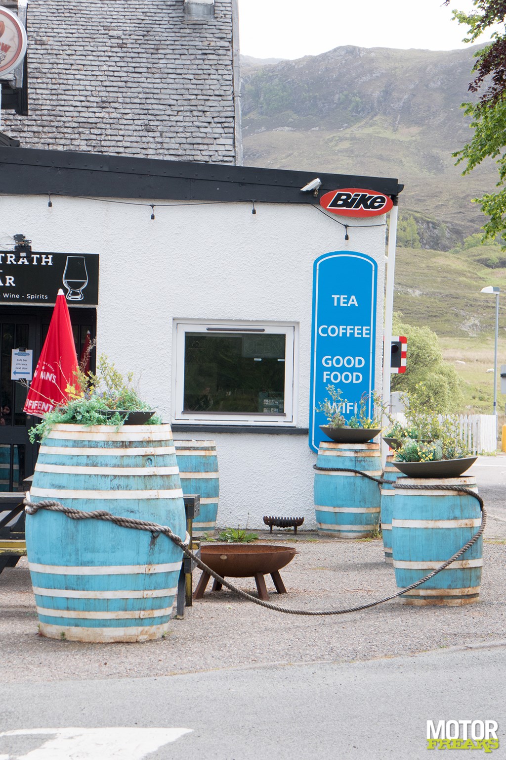 De weg naar de Applecross Pass is een droom voor motorrijderspower van de viercilinder regelmatig aanspreken om van de spaarzame inhaalmogelijkheden gebruik te maken. Je hebt aan een klein gaatje genoeg en dat is erg lekker. Zo komen we vlot bij The Bridge Café in Spean Bridge voor een blueberry muffin en een koffie. Lekker!