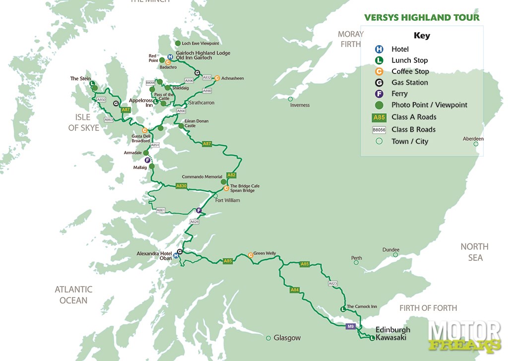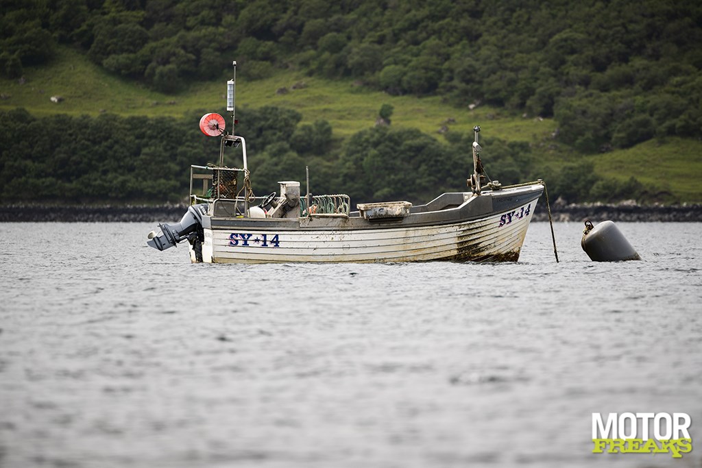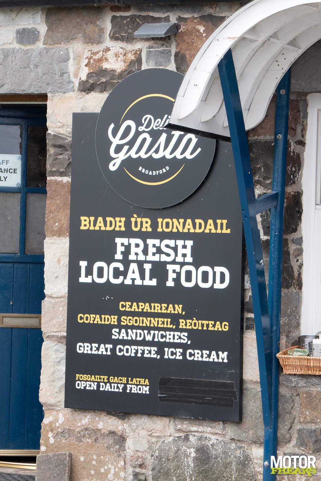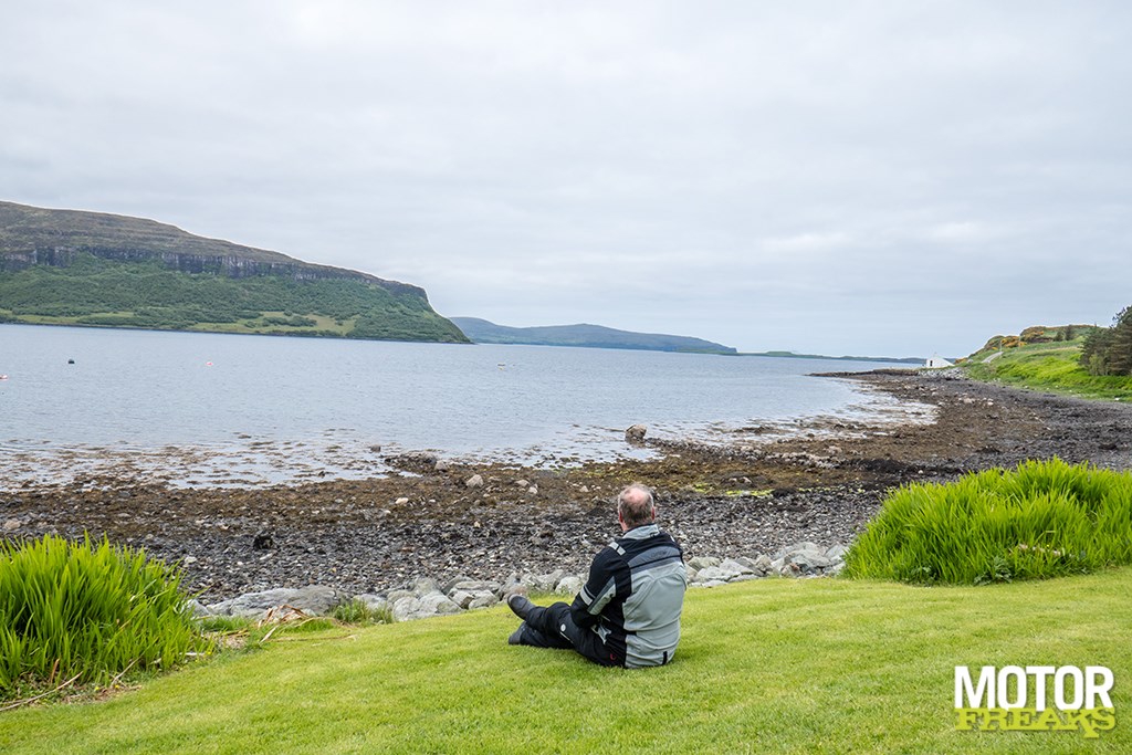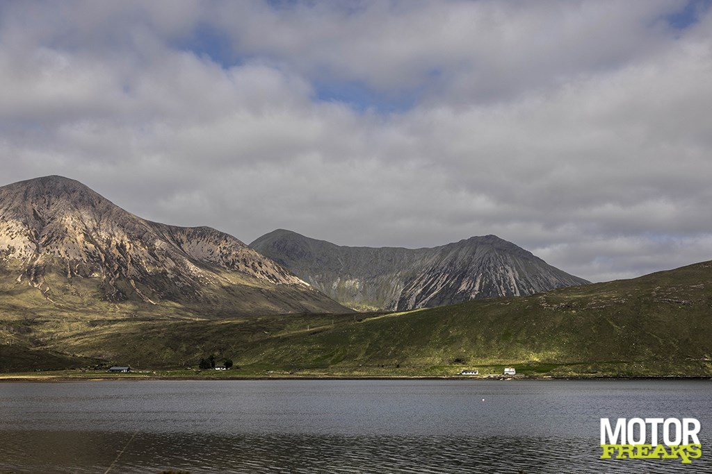 Wanneer we in het ochtendgloren de motoren beladen, blijken we zelf op het menu te staan van ontelbare midgets, een soort bijtgrage minimuggen. Als we wegrijden voel ik ze hier en daar nog in mijn helm en in mijn pak bijten. Afijn, als ze hun ontbijt ophebben en de zon doorbreekt, verdwijnen ze en stormen we via Achnasheen door naar the Kyle of Lochalsh, waar we via de Sky Bridge over Loch Alsh op het eiland Sky terechtkomen. Na een koffiestop in de Deli Gasta in Broadford nemen we de kustweg,