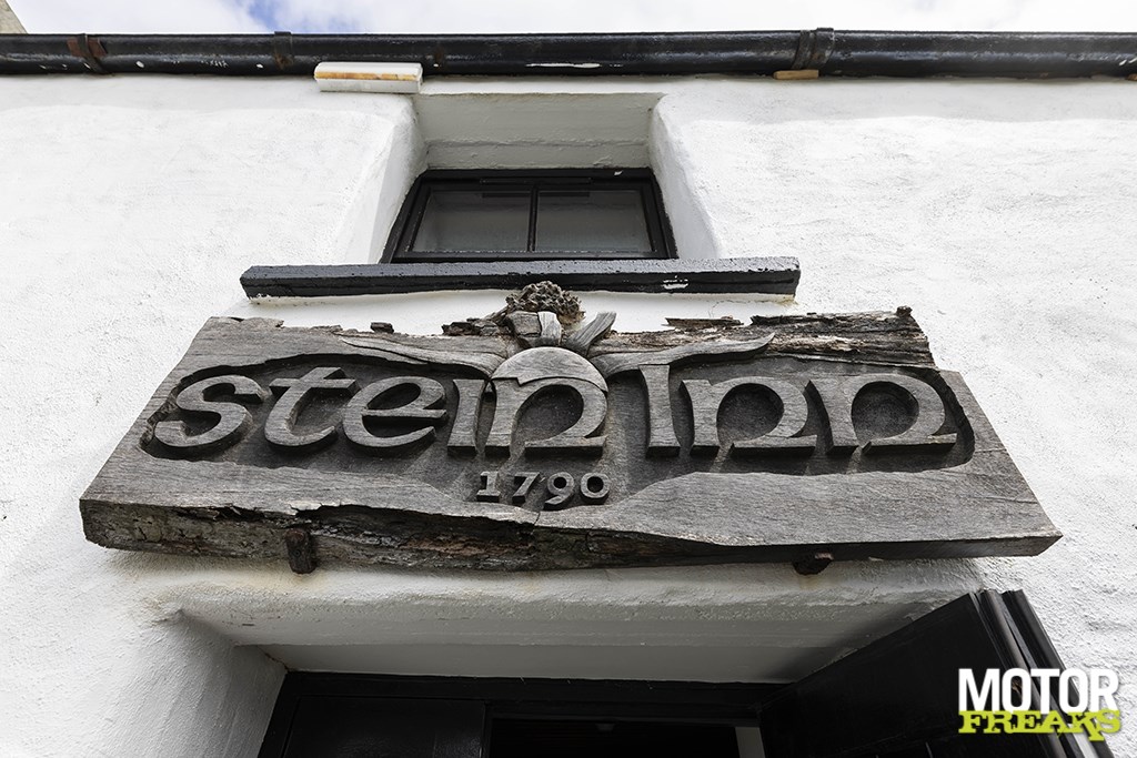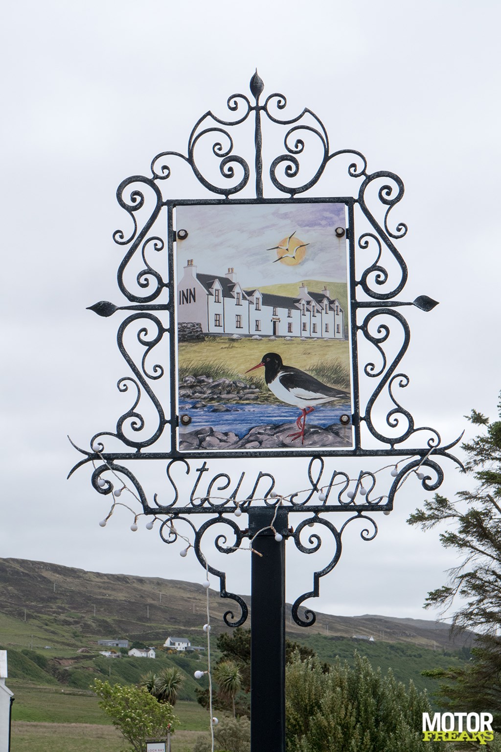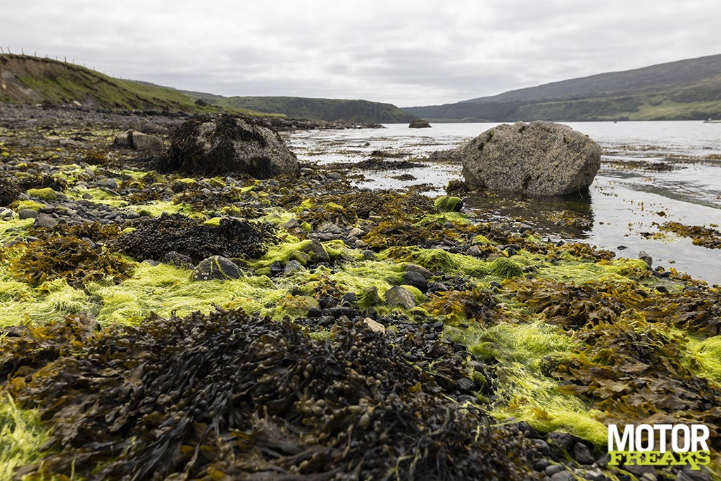 Na Edinbane koersen we westelijk over een fijne, brede weg, tot we na een kilometer of vijf een kleine single track inslaan, die zich met erbarmelijk slecht asfalt over de kale heuvels slingert. Ik ben blij dat de Versys nog over enige allroad-genen beschikt, met veerwegen van 150 mm voor en 152 mm achter, gecombineerd met de elektronische skyhook-demping, die de demping real-time op het wegdek afstemt. Dat houdt de motor strak en rustig op het asfalt en zorg dat je zelfs op dit soort wegen nog met redelijk comfort vooruitkomt. Lang hoeft dat echter niet, want na het dorpje Lusta zakken we af naar de kust, naar de Stein Inn. Het is de oudste herberg van Schotland, direct aan de kust van Loch Bay en met een geweldig mooi uitzicht op de baai.