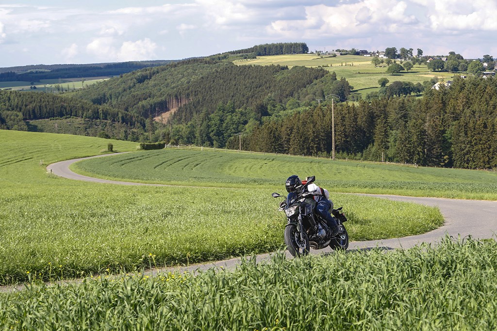 De grootste kick krijg ik in de Noord-Eifel, de 266 om Simmerath klimt langzaam omhoog, maar ik weet dat daarna een steile afdaling volgt en zorg dat ik precies op het hoogste punt een snelheid van 105 km/u volgens TomTom aantik. Koppeling in, run-off en de motor direct in z’n vrij zetten, om vervolgens de hele afdaling een snelheid van 75-85 km/u aan te kunnen houden. Ik heb geluk, er is geen enkele tegenligger op dit stuk, waardoor ik geen enkel moment hoef te remmen – ook niet in de bocht en als in een linker haarspelbocht de route rechtsaf gaat kan ik de haarspeld dwars oversteken en zonder snelheid te minderen rechtsaf gaan. Met stomme verbazing gadegeslagen door twee sportieve