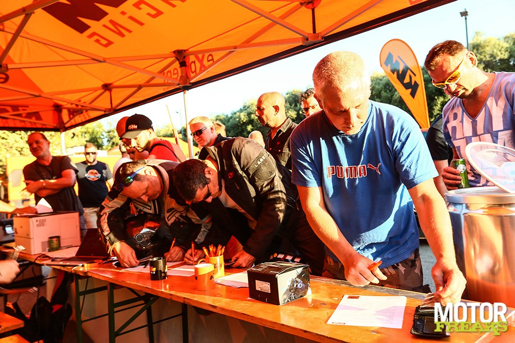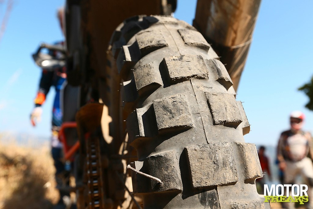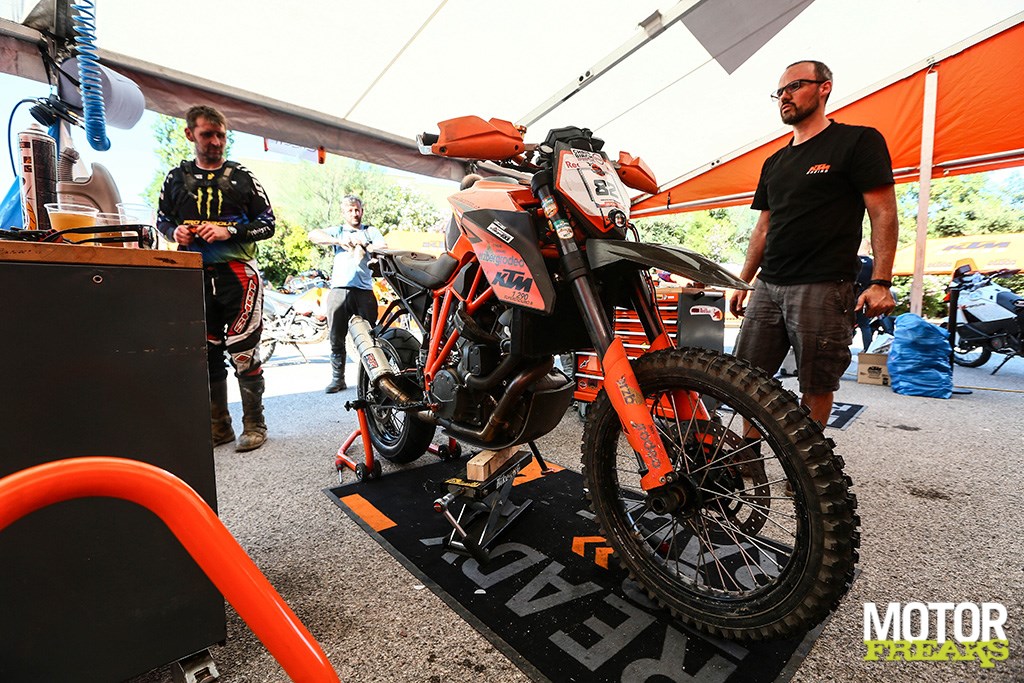 In het basiskamp net buiten ons hotel gearriveerd voor de officiële inschrijving staat voor de servicetruck een bont gezelschap aan KTM’s opgesteld om van vers offroad rubber – als in de Continental TKC 80 – te worden voorzien. Service van KTM dat gedurende het event gratis service aan de deelnemers aanbiedt, ongeacht of het nu gaat om het wisselen van rubber of uitvoeren van reparaties als gevolg van een val of een technisch probleem. Ik mag het de komende drie dagen met een 1290 Super Adventure R doen, maar heb zo wel m’n twijfels. Geen idee of dit de versie is met verlaagd zadel waar ik om had gevraagd, met opstappen ik krijg nog steeds maar nét een voet aan de grond. Nu is dat iets waar ik op straat