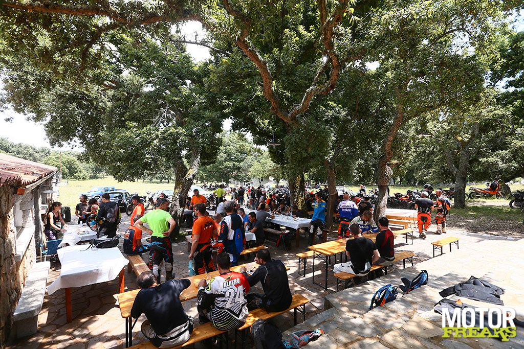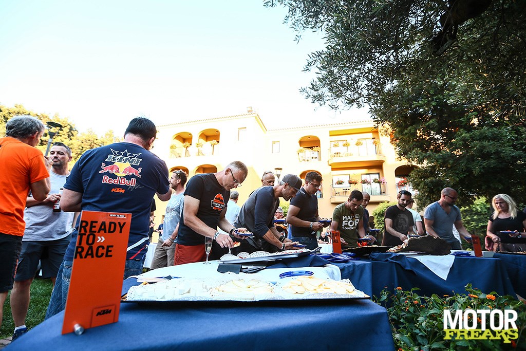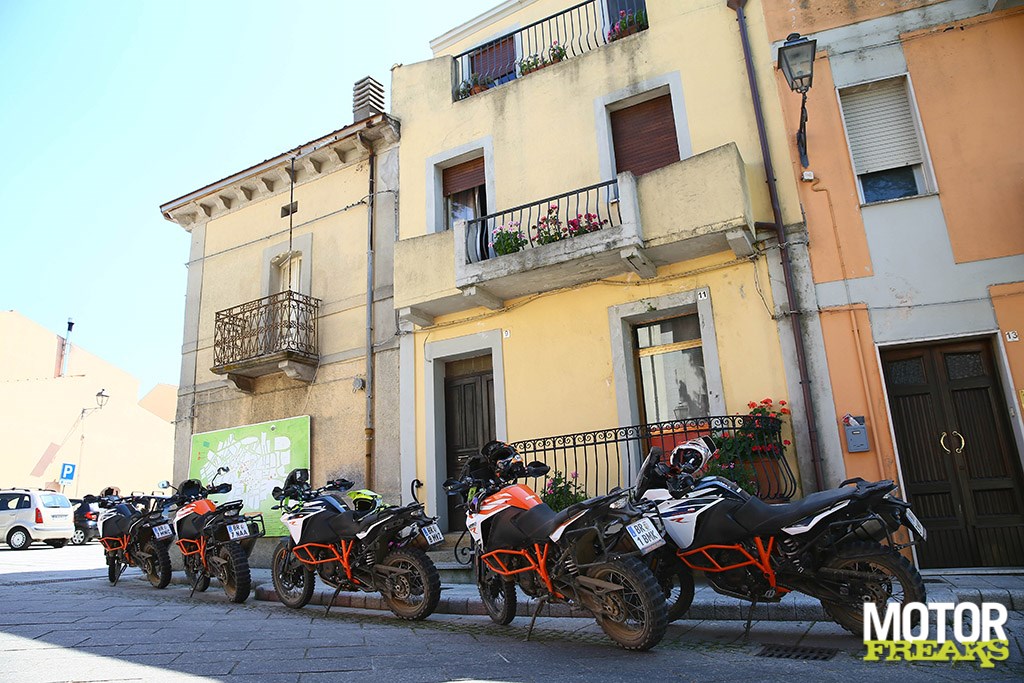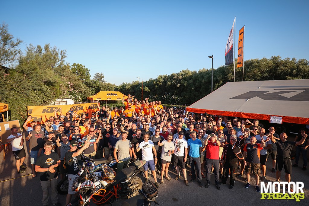 150 man tegelijk aan de lunch. Probeer dat maar eens in goede banen te leidenMoskou afgelegd, zij hadden een afstand van 5.500 km moeten overbruggen tot Sardinië, wat ze 11 dagen had gekost. Het verst van huis was echter een Colombiaan, die samen met een Duitser die op de ambassade in Colombia werkt vanuit Colombia naar Duitsland was gevlogen en vandaaruit op een 1090 Adventure R naar Sardinië was afgereisd.Maar liefst 14 verschillende modellen waren te ontdekken in het basiskamp, variërend van een 640 Adventure tot een 1290 Super Adventure T. Een deelnemer had het wel heel erg bijzonder gemaakt: hij had zijn 1290 Super Duke R tot een heuse Adventure omgebouwd. Gereden werd in groepen van maximaal 10 man, ingedeeld op ervaring zodat iedereen het tempo kon rijden waar hij of zij zich prettig bij voelt. En daarbij de juiste begeleiding zou krijgen.