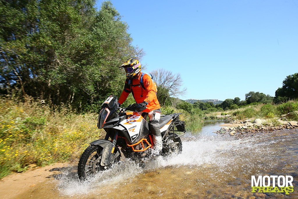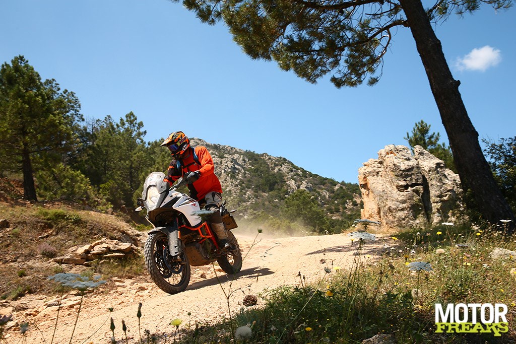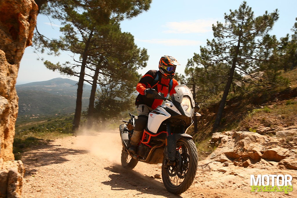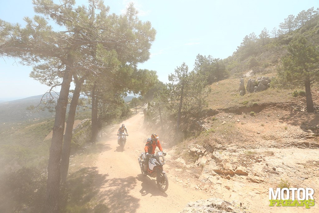 kilometer lang en 100% offroad is, wordt al snel een flink stuk pittiger. Het pad gaat dwars door een bosrijk gebied en wordt niet alleen als maar smaller, maar daarbij wordt de ondergrond steeds extremer met losse stenen, rotsblokken en diepe groeven die door honderden jaren erosie zijn ontstaan. Vooral niet focussen op de grond, maar ver vooruitkijken en op het gas de moeilijkste hindernissen nemen gaat me verrassend goed af en is een enorm compliment aan de 1290 Super Adventure R, waarvan de Offroad modus en de souplesse onderin een enorme helpende hand is.