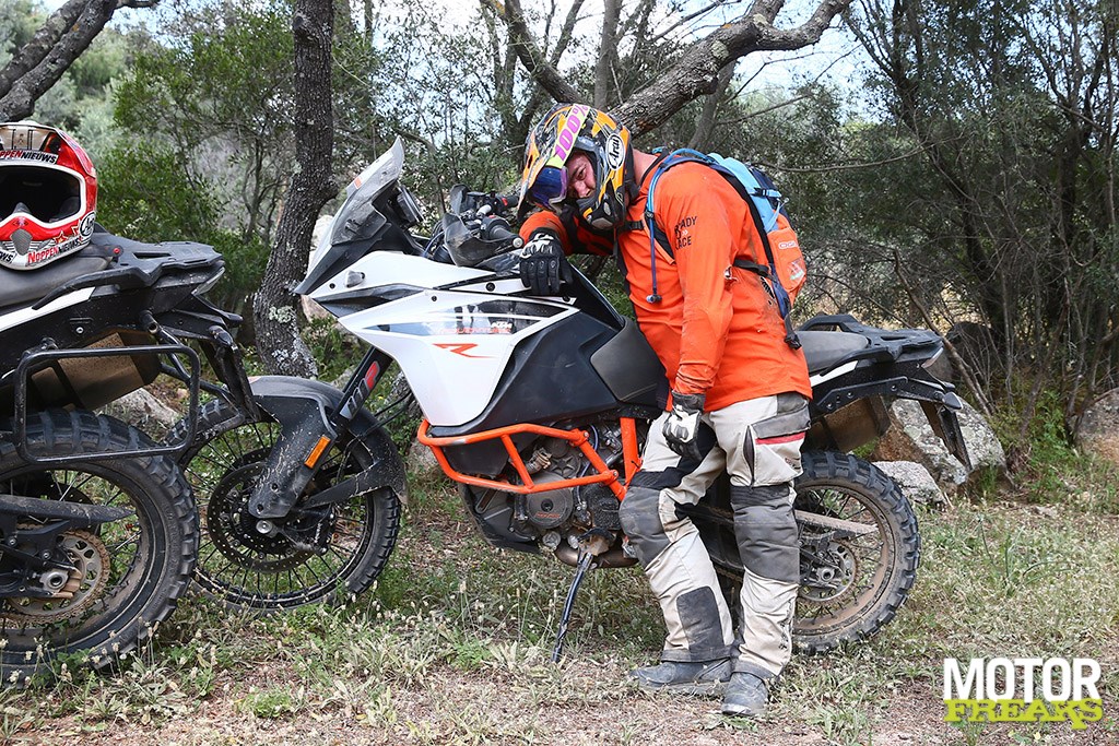 Eenmaal weer bij de rest van de groep gearriveerd maak ik dankbaar gebruik van de geste van een van de Duitsers, die voorstelt om over te stappen op zijn 1090 Adventure R, wat blijkt een gouden zet te zijn. Op papier schelen beide motoren slechts 10 kilo in gewicht, maar met rijden lijkt dat verschil minstens drie of vier keer zo groot te zijn. Zo groot is dus de invloed van inertia op de stuureigenschappen van een fiets. De 1090 Adventure mist weliswaar het bullige van de 1290 onderin, maar het nemen van alle hindernissen gaat me nu zoveel gemakkelijker af dat ik de andere Duitser inmiddels achter me laat. Voor m’n gevoel hebben we het moeilijkste deel wel gehad en het resterende deel van de in totaal 100 kilometer tot de lunchstop toe is dat ook zeker het geval, maar de 70 kilometer die ’s middags nog moeten worden afgelegd zijn minstens zo inspannend. Alsof we in een trialparkoers verzeild zijn geraakt, zo technisch is bij tijd en wijle het parkoers, maar de 1090 Adventure R sleept me erdoorheen, waardoor ik zonder te vallen aan het eind van de middag moe maar voldaan de motor tegen het eind van de middag weer in het basiskamp parkeer.