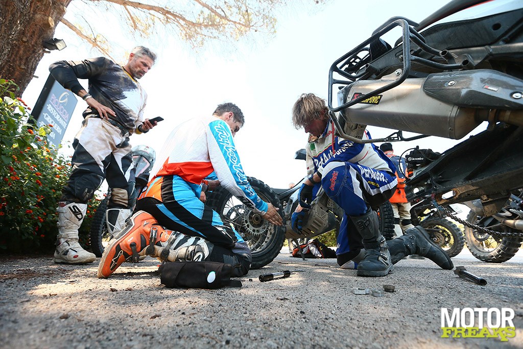 Vanwege de extreme hitte is het deel na de lunch niet minder zwaar (en stoffig) en als dat niet erg genoeg is heeft de Italiaanse collega Francesco lek gereden in een van de Pro secties die hij samen met de Duitser die met mij heeft geruild en Chris Birch heeft gedaan, maar heeft voor de noodreparatie wel een plek in de schaduw opgezocht. Niet veel later prijkt ook bij mij voor de tweede keer een mooie spijker in m’n achterband, maar opnieuw in een nop waardoor ik verschoond blijf van een lekke achterband. En dat is maar goed, de 1290 Super Adventure van Francesco had ten minste nog een middenbok wat repareren een stuk eenvoudiger maakt. De reparatie heeft ons echter veel tijd gekost en met best veel verkeer op de route langs de kust besluiten we de laatste kilometers niet meer offroad te gaan, maar direct door te rijden tot de strandtent, het officiële eindpunt van de tweede dag.