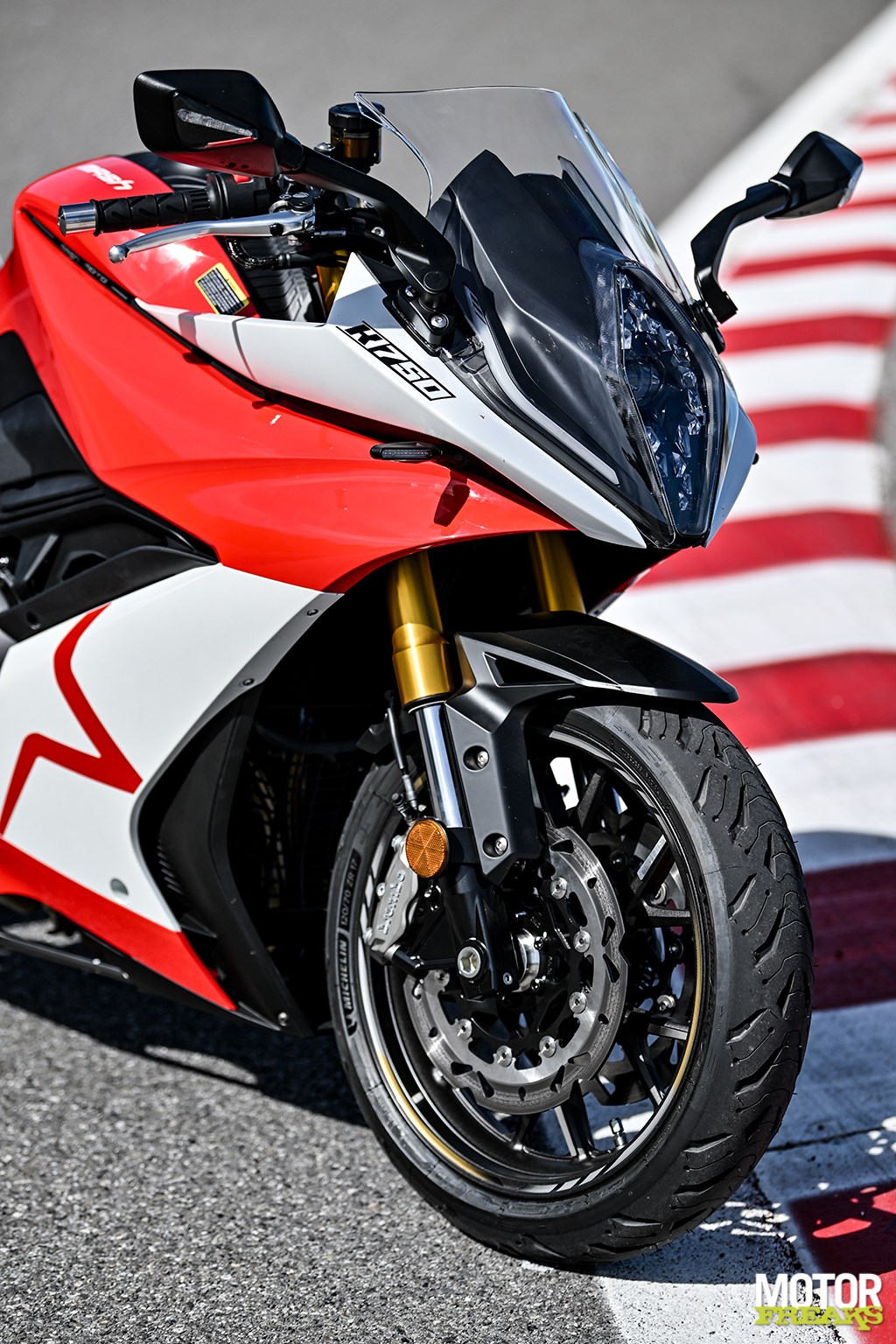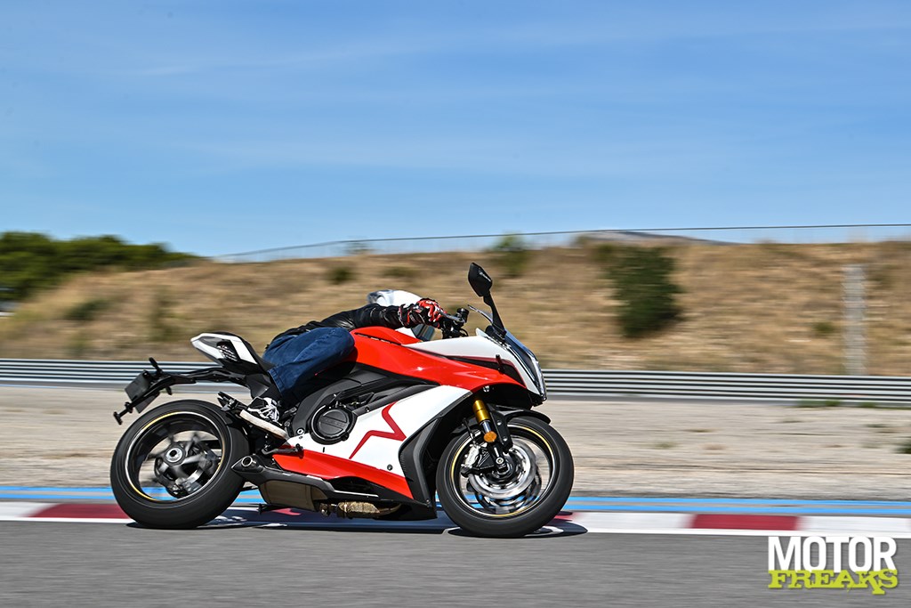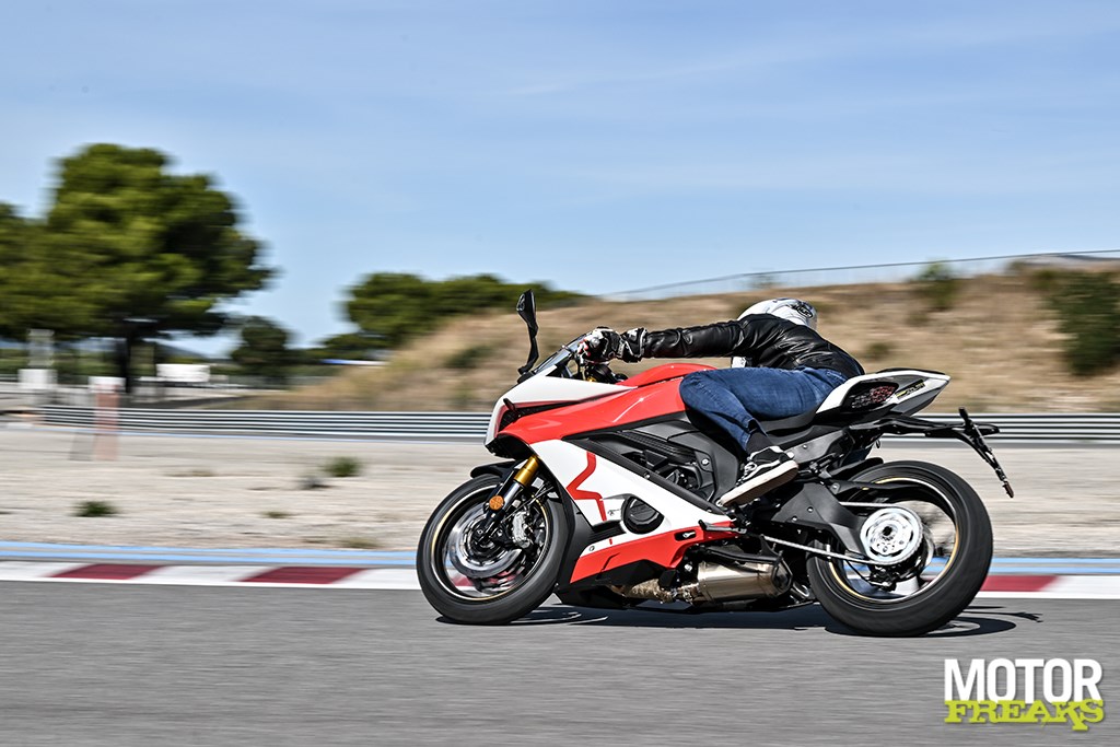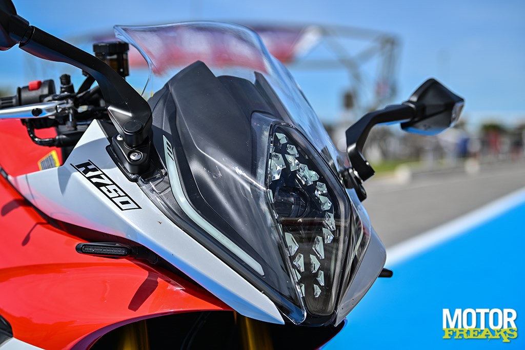 Nog meer cijfers? De K750 heeft een wielbasis van 1.464 mm en dat is weliswaar in lijn met de wielbasis van Suzuki's GSX-8R, maar wel flink langer dan die van de Aprilia RS660 (1.370 mm) en de Yamaha YZF-R7 (1.395 mm). Ook wat het gewicht betreft ligt de K750 met 206 kg rijklaar met volle 14 liter tank op het niveau van de GSX-8R, die 205 kg op de schaal zet, maar dat zijn eveneens flink wat kilo's meer dan de RS660 (183 kg) en R7 (188 kg).
