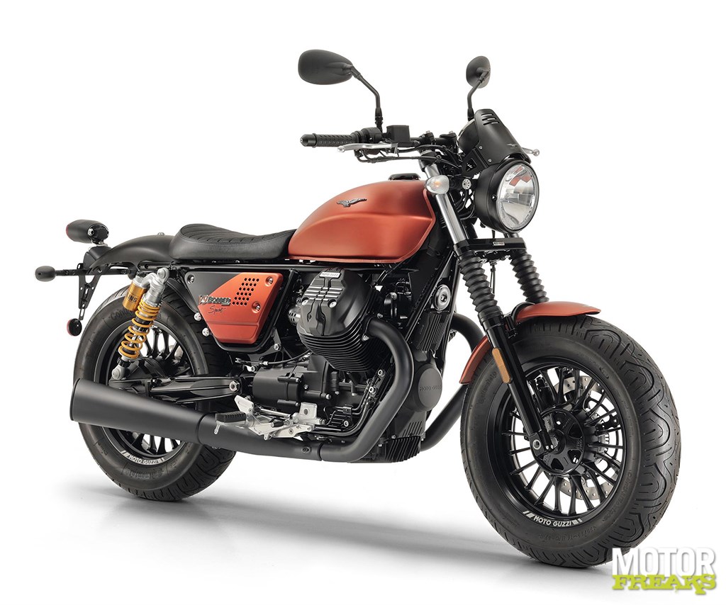 De Bobber Sport is uit duizenden te herkennen aan z'n speciale kleur. Voor de tank en de aluminium zijpanelen is een geheel nieuwe, krachtig oranjetint gebruikt, die fraai contrasteert met de typerende diepzwarte afwerking van de V9 Bobber. De tank wordt -uiteraard- aan weerszijden gesierd door een speciaal bewerkte Moto Guzzi-adelaar.