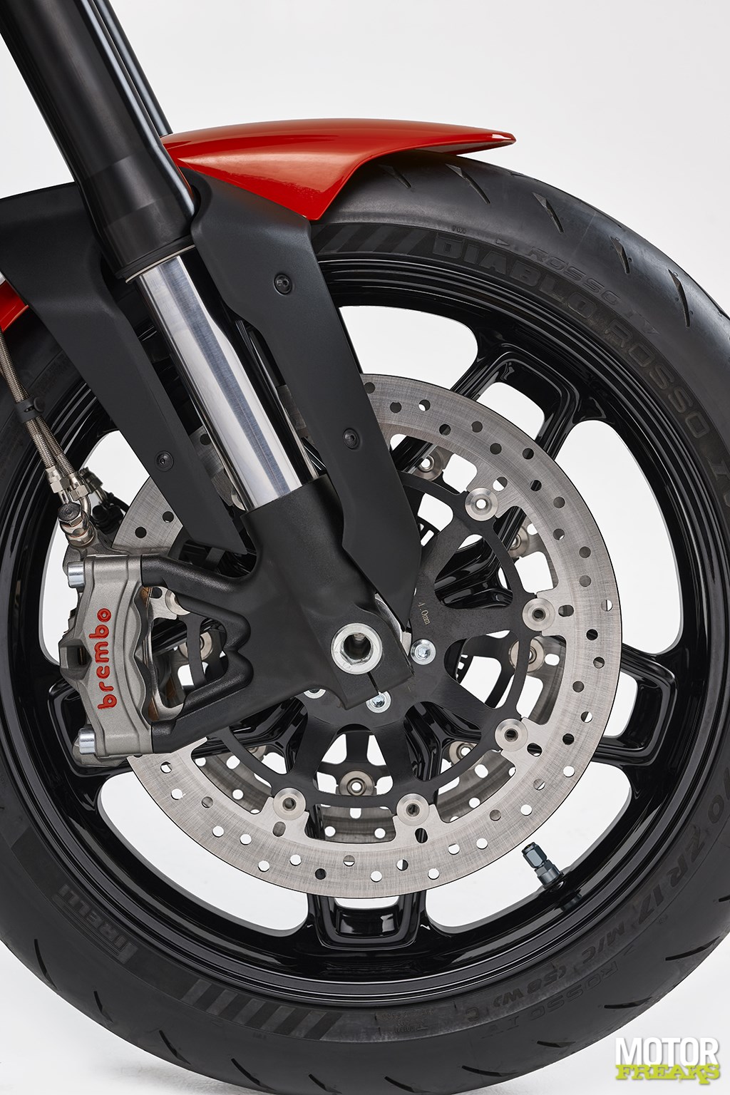 Zoals het een echte Italiaan betaamd zijn de remmen voor rekening gekomen van de firma Brembo, met dubbele 320 mm schijven en radiale Monobloc remklauwen voor en een enkele 255 mm schijf met eenzuiger remklauw achter. Uiteraard voorzien van bochten-ABS.