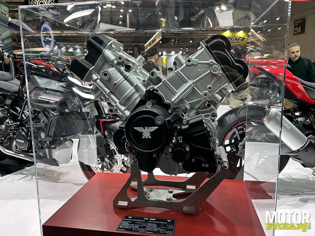 Dé blikvanger op de EICMA in Milaan, de nieuwe 90° 750 V-twin, die is ontworpen om 14.000 tpm te kunnen draaien heeft een cilinderinhoud van 749 cc uit een boring x slag van 90 x 58,9 mm, voorzien van dubbele kettingaangedreven bovenliggende nokkenassen en een tegengesteld roterende in glijlagers gemonteerde krukas, voor verbeterde handling bij het insturen van een bocht, door het reduceren van de massatraagheid met wel 10%.