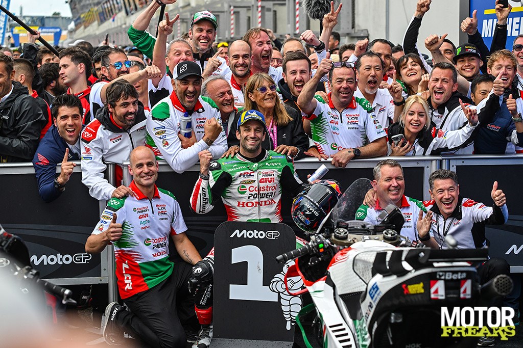 Met een voorsprong van 20 seconden werd Johann Zarco als winnaar afgevlagd en is daarmee de allereerste Franse MotoGP coureur sinds Pierre Monneret in 1954 die de Franse Grand Prix op naam schrijft, de eerste overwinning ook voor Honda sinds Alex Rins in COTA 2023. De #93 pakt belangrijke punten in de strijd om de wereldtitel omdat zowel broer Alex als teamgenoot Pecco geen punten scoorden. Fermin Aldeguer maakte voor de tweede keer dit weekend het podium compleet.