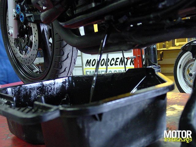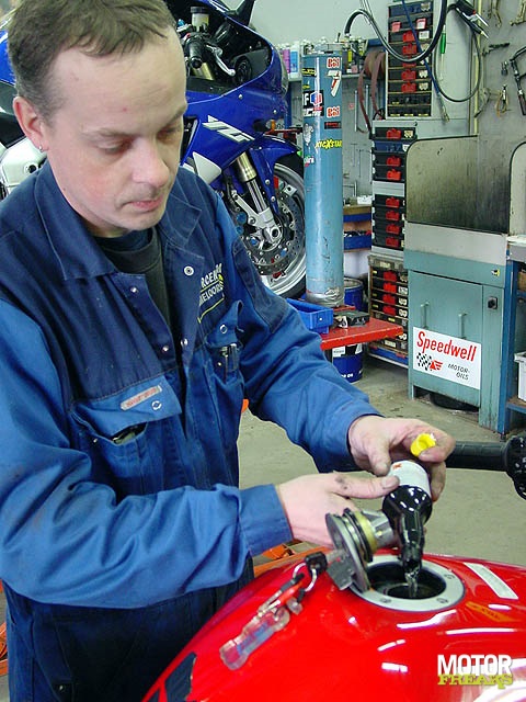 Als u thuis niet over een verwarmde garage beschikt, dan verdient het aanbeveling om uw motorfiets helemaal af te tanken. Waarom? Dan krijgt vocht geen kans om de binnenkant van uw tank om te toveren tot een roestbak. In Emmeloord doen ze er nog een schepje bovenop, en voegen een additief toe aan de benzine. Dit spulletje, Forté Motopower II geheten, voorkomt ´verrubbering´ van de benzine, en reinigt de verbrandingsruimte van de motorfiets als je weer gaat rijden. Abe van Motorcentrum Emmeloord hierover: “Zelf ben ik nooit zo gek geweest van additieven. Veel van die spulletjes zijn ronduit rotzooi. We hebben allemaal wel eens zo´n TelSell reclame gezien waar iemand dankzij een wondermiddel zonder een druppel motorolie kilometers ver kon rijden. Trap er niet in.â€ÃƒÆ’‚ Motorfreaks: “En dat Forté flesje dan? Wat is het TelSell gehalte daarvan?â€ÃƒÆ’‚ Abe: “Dat werkt wél, is relatief goedkoop, dus passen we het toe. Het kan het verschil uitmaken tussen meteen wegrijden, of de tank moeten aftappen om er verse benzine in te kunnen gooien.â€ÃƒÆ’‚