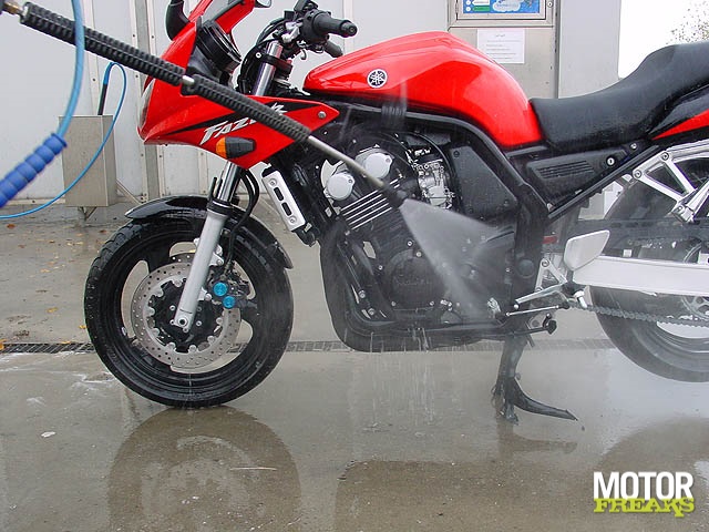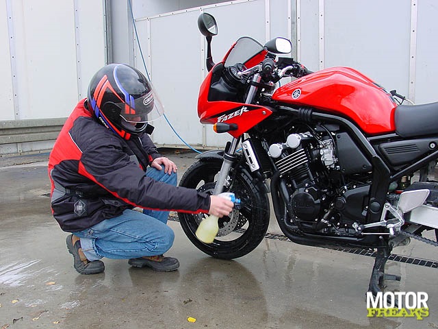 De eerste stap is het schoonmaken van de motorfiets. Vuil, stof, vet en allerhande andere zaken verzamelen zich in de loop van de tijd in en op allerlei onmogelijke en verborgen plekjes. Allereerst gebruikt men een speciale motorreiniger om vet en olie op te lossen. Dit mag nooit en te nimmer gebeuren als het motorblok nog heet is! Na een zekere inwerkperiode (max. 5 minuten) wordt de fiets met behulp van koud water afgespoeld. Dit kan met behulp van een gewone waterslang of met een hogedrukreiniger. Zet een hogedrukreiniger altijd in een waaier- of vernevelstand, en spuit niet van een te korte afstand af.