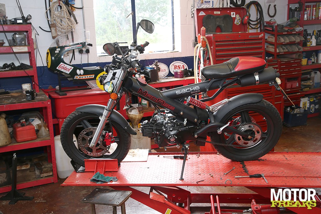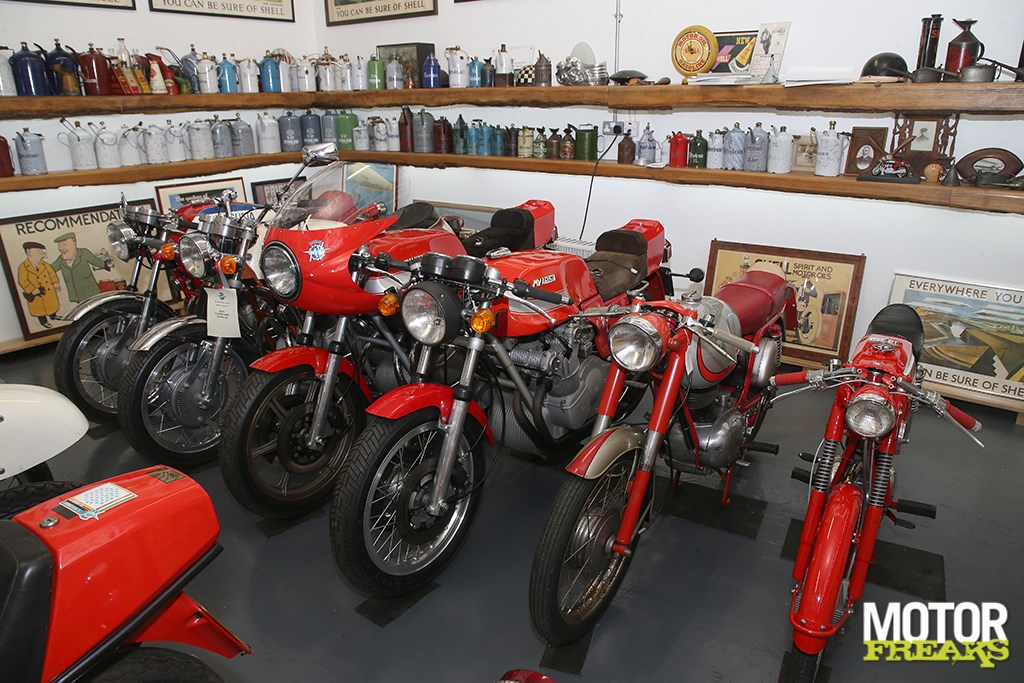 De Italiaanse hoek. Of beter gezegd: de Italiaanse kamerwe hadden een MV dag op een vliegveld en ik reed 200 km/u op de startbaan.” In een andere sectie van The Shed staan een half dozijn Rumi’s, allemaal 125 cc tweetakt variërend van een Formichino scooter tot een van kenteken voorziene 125 GP racer. “Ze zijn Italiaans ontwerp ten voeten uit, maar in bepaald opzicht zo bizar”, zegt Robert. “Ik hou van alle Italiaanse onderdelen die erop zitten, zoals het schakelpedaal waarvan een Italiaanse gast me zei dat ‘ie zo gevormd was om ook met de hak te kunnen schakelen, zodat je schoenen mooi konden blijven blinken.