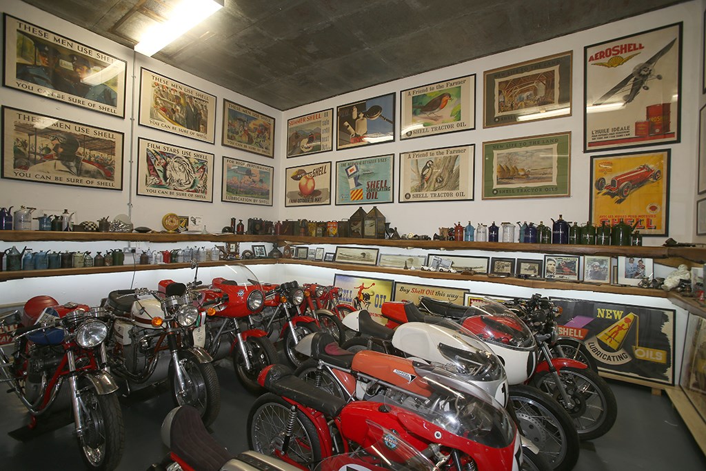 Sommige mensen gaan postzegels verzamelen als je de pensioenleeftijd hebben bereikt. Robert Lusk ging motoren verzamelen. Onder anderegrensgebied Kent/Sussex te verhouden, waar ze een voormalige appelgaard met 80 hectare aan fruitbomen en 135 hectare bos kochten. “Ik kan elke dag een uur lang offroad rijdenzonder op de openbare weg te komen”, zegt Robert, die de legendarische rock gitarist Jeff Beck tot buurman mag rekenen, en zijn collectie Custom auto’s.Het landgoed omvat een pittoreske boerderij en een joekel van een schuur, die hij The Shed heeft genoemd, met daarin een drietal 60 ton koelingen waar elk najaar de appeloogst werd opgeslagen. De ruimtes werden door Lusk omgebouwd tot tentoonstellingsruimtes voor zijn eclectische collectie van ongeveer 100 motoren en bijpassende spullen als glazen bollen van benzinepompen, oliekannen en dat soort zaken. De ruimte waar vroeger het fruit werd verpakt is omgebouwd tot restauratiewerkplaats – tevens werkplaats voor Robert en zijn helpende hand John Rhodes om de motoren waarmee hij, in het negende decennium van zijn leven, racet te prepareren. Mr. Lusk neemt nog steeds deel in de Classic Club roadracing scene – en zeker niet onverdienstelijk!