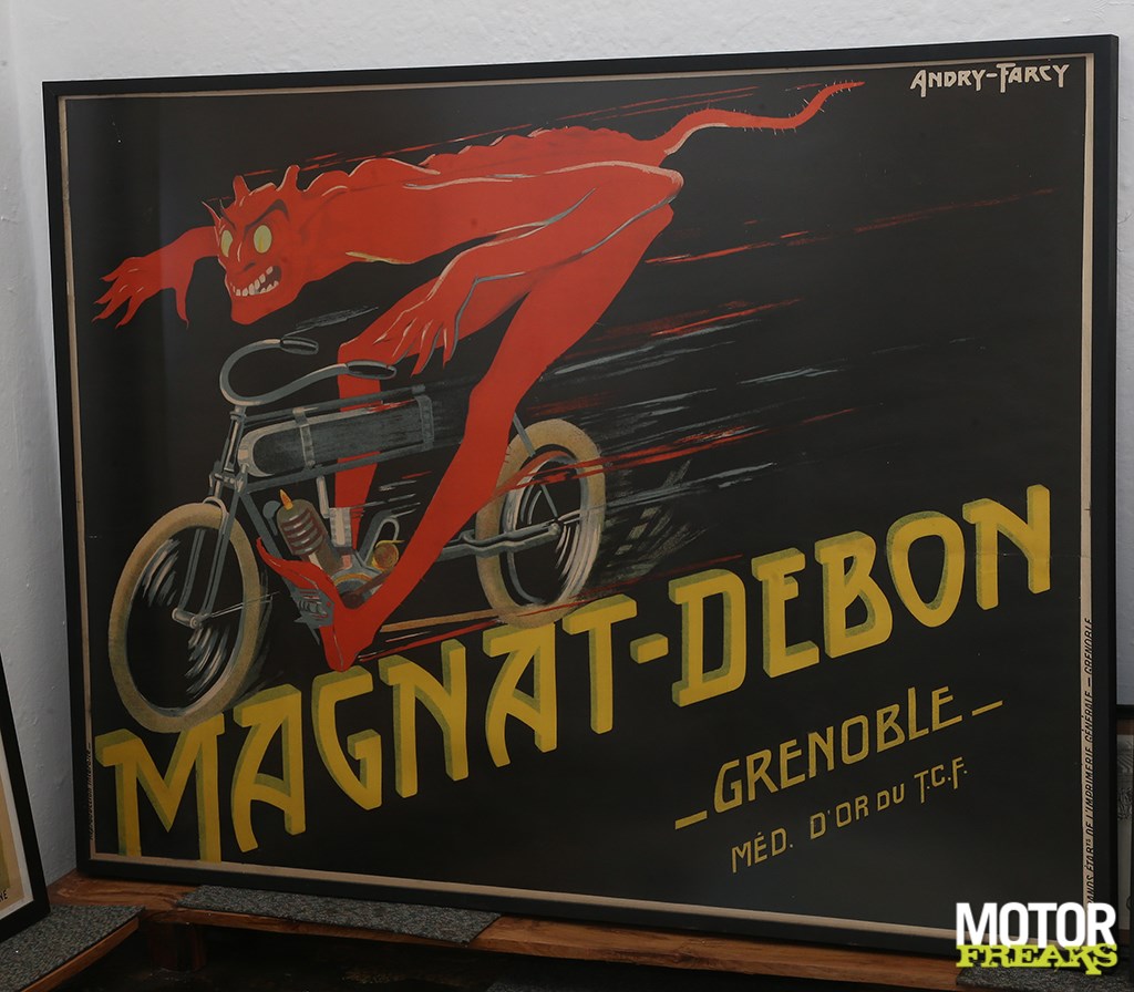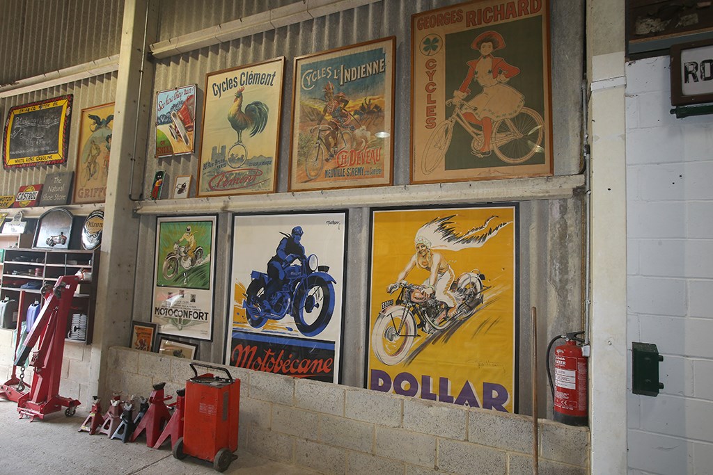 Na iets meer dan 100 motoren in bezit te hebben gehad, heeft Robert Lusk zijn collectie tot ongeveer 60 motoren teruggebracht. Waarom? “Ik ben altijd in grafisch ontwerp geïnteresseerd geweest en raakte gefascineerd door de kunst van de poster”, legt Robert uit. “Ik dacht na wat voor impact de motorfiets in die tijd op kunstenaars heeft gehad, toen ze nog nieuw waren – zo rond de eeuwwisseling. Hun invloed reikte destijds tot landschappen en paarden, of kerkelijke en historische beelden – maar toen was er ineens dit ding met zelfaandrijving dat het avontuur van reizen vertegenwoordigde. Een auto of motor bracht je overal en het kreeg een grote invloed op de levens van mensen, alleen al omdat je ’t kon zien. Daar begon dit dus allemaal mee – ik vroeg me af, hoe reageerden die gasten er destijds op? Hoe heeft het ze beïnvloed? Dus begon ik posters te verzamelen, voornamelijk originelen. In mijn gehele collectie van meer dan 200 posters zitten waarschijnlijk slechts 6 replica’s tussen. Ze tentoonstellen is een uitdaging, uiteraard – vandaar de behoefte om ruimte vrij te maken en wat geld te vergaren door wat van mijn collectie te verkopen.