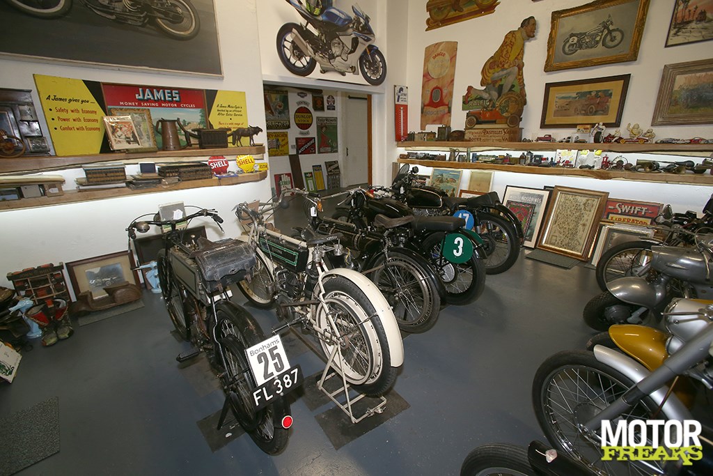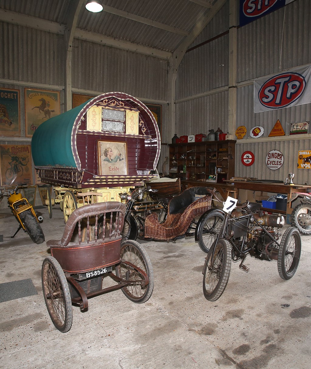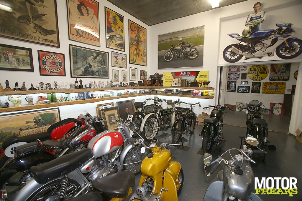 Na met de racers een basis voor z’n collectie te hebben gevormd ging Lusk ook uitkijken naar andere tweewieler verzamelobjecten. “Mijn kantoor in Londen is tegenover Olympia, waar destijds twee of drie keer per jaar een Bonhams veiling was, dus kon ik zo effe binnen proppen. De allereerste motor die ik kocht staat nog steeds in The Shed, een Belgische 1902 Minerva, een fiets met motoraandrijving voor eenvoudig transport.