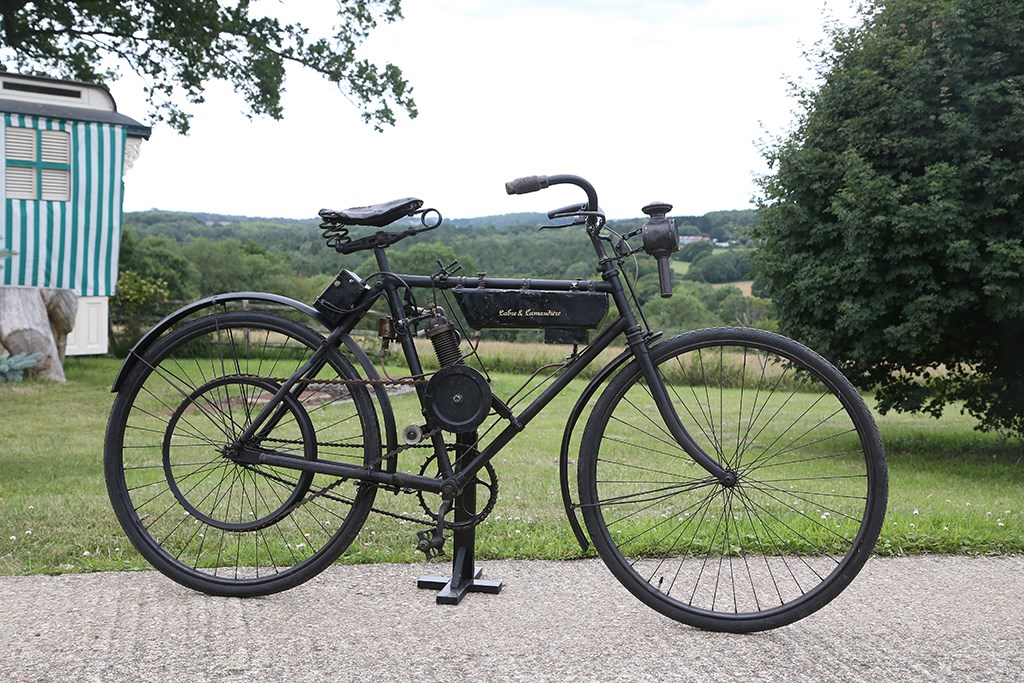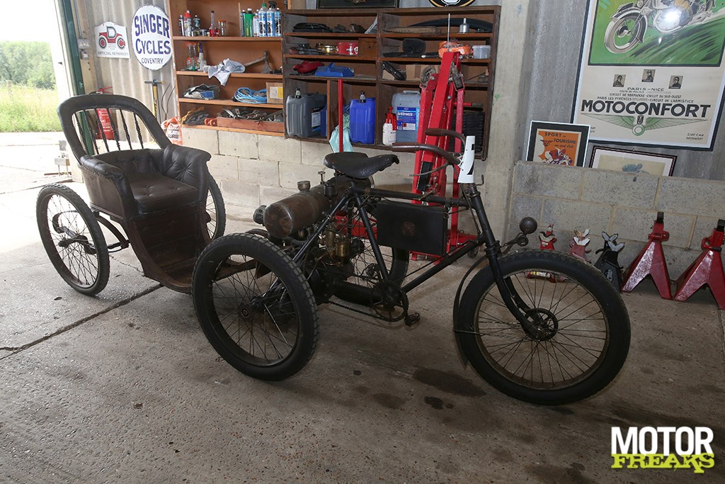 Naast racers bouwde Lusk dus een collectie motoren uit de beginperiode op, waaronder een 1910 viercilinder Pierce en 1912 Henderson Four, Amerikaanse exoten uit de beginperiode van motorerfgoed van zijn vaderland. Een 1907 Minerva werd daar aan toegevoegd – een degelijke V-twin die z’n nederige clip-on voorouder flankeert. Er is ook een fragiel ogende maar complete Labre et Lamaudière die in 1901 in Parijs is gemaakt, wiens 120cc motorblok een atmosferische inlaat en mechanische zij-uitlaatkleppen heeft – en een elektrische starter. Ook Frans, zowaar nog ouder is Lusks 1898 Rochet driewieler met 2,5 pk De Dion motor, die hij in Italië kocht. “Het doet mij iets – en anderen ook”, zegt Robert. “Chester heeft ermee de London to Brighton run gereden en we stonden op de startgrid toen een of andere Franse liefhebber zich naar