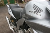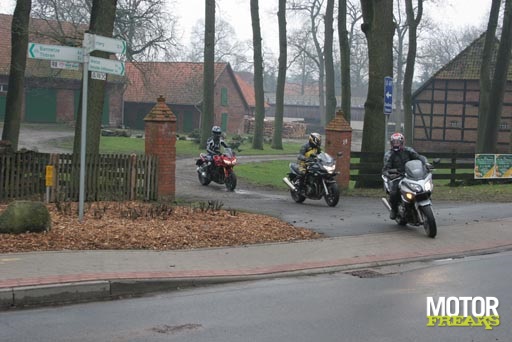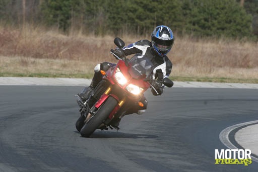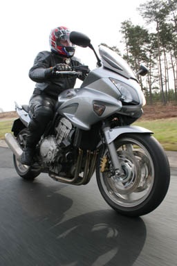 Als ik dit zou betrekken op de drie geteste motoren en ik begin bij de Honda dan heeft die misschien wel de beste act. Een cliché misschien, maar neem plaats op een Honda, ga er mee rijden en je weet direct: dit is goed, hier is over nagedacht. Alles zit waar het hoort te zitten, funcioneert zoals het hoort te functioneren en het rijdt zoals het hoort te rijden. In eerste instantie geen wanklank. Of toch? Ja, natuurlijk, er is altijd wel iets te mekkeren. De zithouding is truttig (maar wel heel lang vol te houden), de zachte vering breekt je op als je wat door rijdt, de snelheidsmeter is niet makkelijk af te lezen (getallen staan aan de binnenkant) en de voetsteunen zitten in de weg als je wat flitsender wilt sturen. En dat is jammer want sturen doet hij prima! Lekker op rotondes aan rijden en vanuit de heupen die "verkeerdoceerpunten" ronden. Oh wat gaat dat makkelijk en soepel. Het uit de Fireblade stammende blok is behoorlijk teruggetuned, zeg maar afgeknepen, ten behoeve van een sterk middengebied. Dat is gelukt, maar van mij hadden ze een paar paarden extra mogen laten zitten want nu is de koek wel erg snel op.