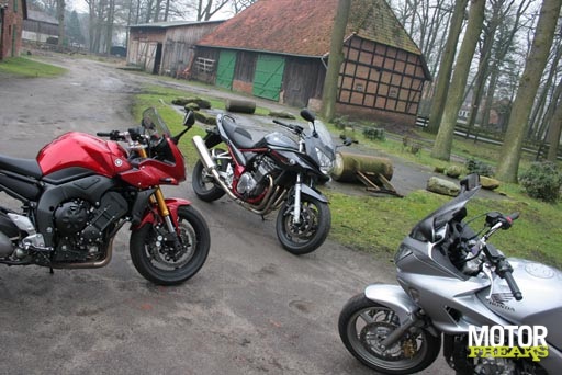 Nu zijn het wel drie motoren in deze test, maar met een regelmaat is er een 2 tegen 1 situatie. Neem bijvoorbeeld het motorblok; zowel de Fazer als de CBF1000 hebben een inhoud van 998cc, terwijl de Bandit er 1157 heeft. Bij het vermogen zijn het juist weer de Bandit en de CBF die gelijk opgaan met beide een opgegeven waarde van 98 paardenkrachten en de Fazer er 150 tot haar beschikking heeft. Ook met de toegepaste techniek is de tweedeling aanwezig. Alledrie zijn weliswaar voorzien van een vier-in-lijn motorblok, maar de Suzuki maakt gebruik van lucht en olie, terwijl de Honda en Yamaha daar vloeistof voor hebben. Voor de benzinetoevoer maken de CBF en de FZ1 gebruik van injectie en doet de Bandit het nog "ouderwets" met carburateurs. Ook heeft de Suzuki met vijf versnellingen er één minder dan de Honda en de Yamaha die er zes hebben.