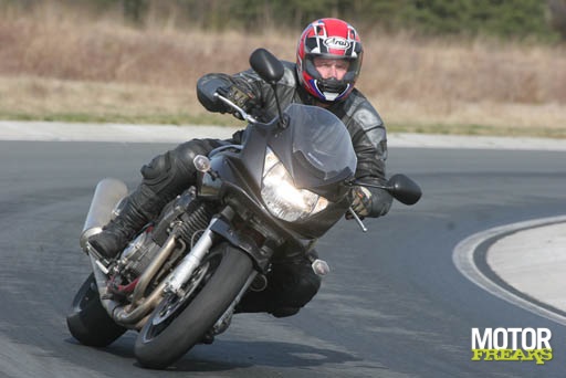De Bandit is een stuk vergevingsgezinder als het aankomt op in welke versnelling een bocht wordt genomen. Daar is het misschien juist eerder dat er misschien teveel toeren wordt gedraaid, waardoor er sneller bij het uitkomen van de bocht opgeschakeld moet worden om voldoende trekkracht te behouden. De remmen zijn wat minder berekend op circuitgebruik. Bij stevig tot hard aanremmen komt er vooral aan de voorkant enige onbalans in de motor. De rechtuitstabiliteit is op de rechte stukken is goed te noemen. In de bochten - en vooral dan in halfnatte c.q. halfdroge omstandigheden - geeft de Bandit wat minder vertrouwen. De combinatie van de (zachtere) vering en gemonteerde Dunlop banden zorgt naar onze mening dat de Suzuki kan gaan zoeken naar de juiste koers. In de bochten is nog wel een redelijke ruimte voordat de slijtbouten het asfalt raken.