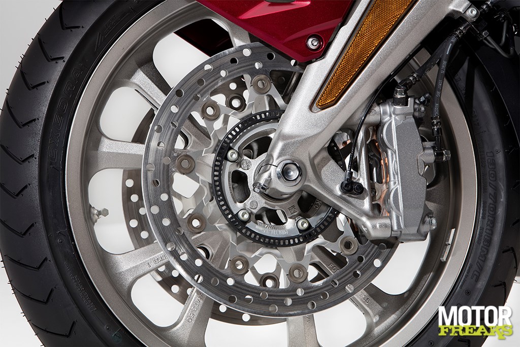 Het logo is terug! Na vijftien jaar..... hopelijk zien we dat nog veel vaker terugvisitekaartje van de Gold Wing geweest. De uitlaatdempers behouden de bestaande structuur, maar de glaswol werd vervangen door resonantiekamers, zodat er ook hier gewicht bespaard is. De vernieuwde uitlaten produceren een mooie, diepe grom. De gekruiste secties van de uitlaten werden (voor 2 van de 6 cilinders) met 20% verminderd, waardoor een dieper geluid geproduceerd wordt.