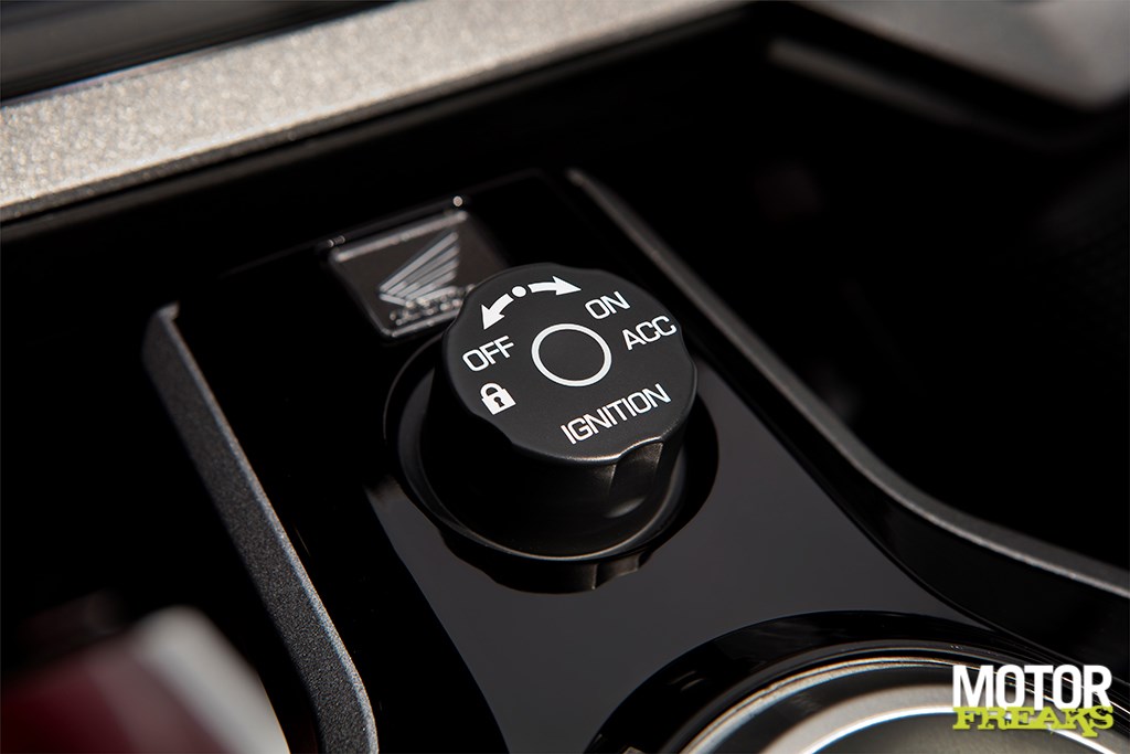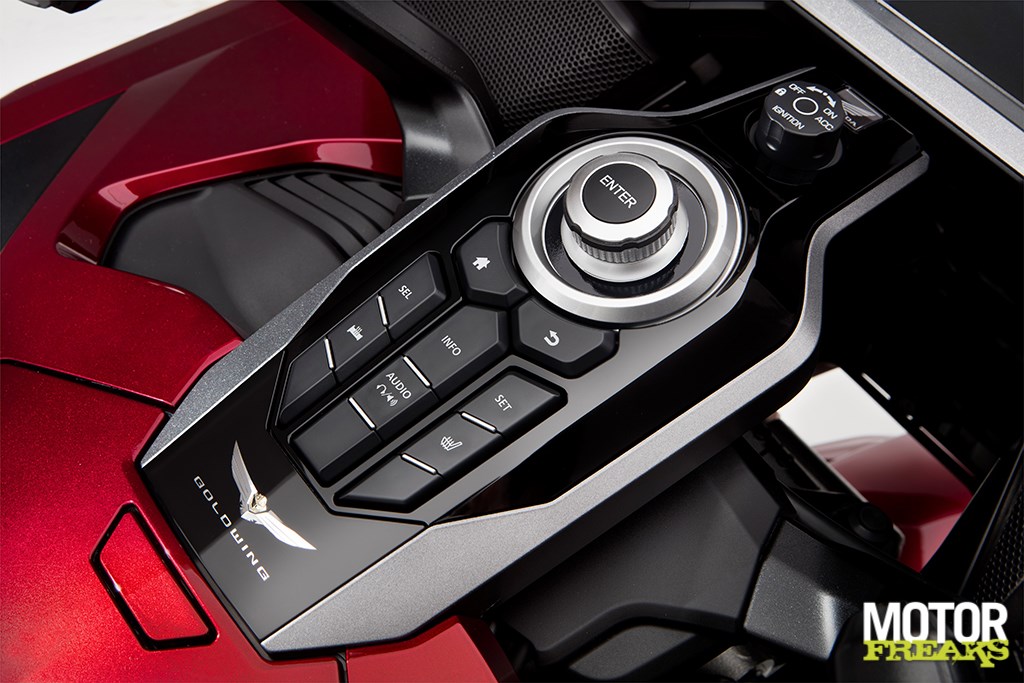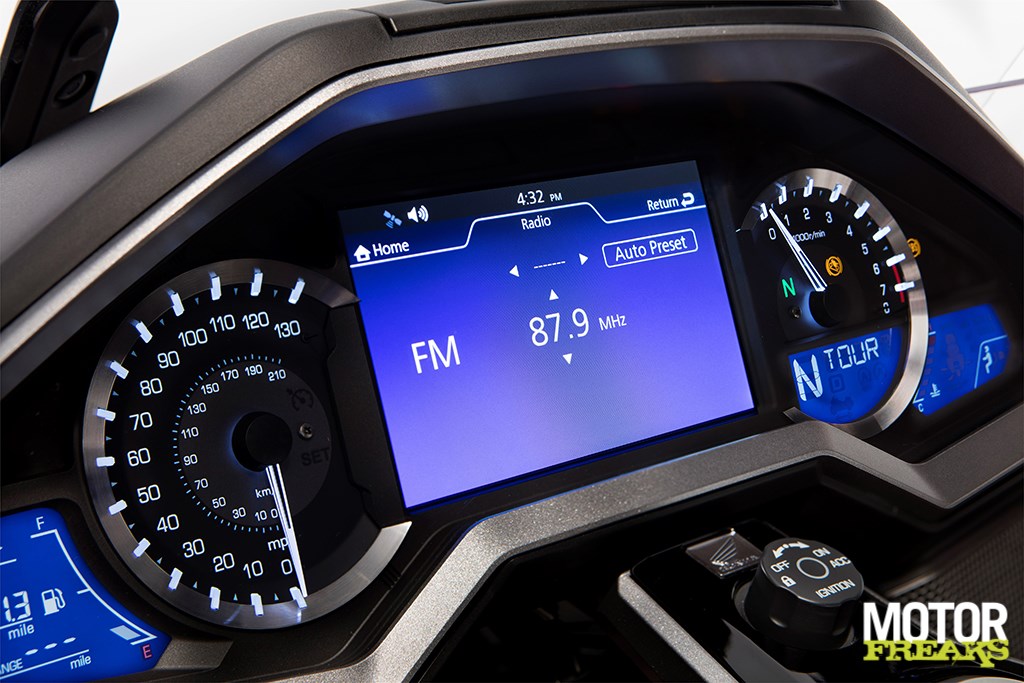 Het dashboard heeft LED verlichting met daarin verschillende kleurvarianten verwerkt. Het 7-inch kleuren TFT-scherm biedt infotainment gerelateerde info voor het audio en navi-systeem, maar geeft ook informatie over het HSTC, de aanpassing van de elektronische vering of bandenspanning. Allemaal heel overzichtelijk, zodat de rijder in één oogopslag alle benodigde informatie ziet. De helderheid wordt automatisch aangepast, maar je kunt ook zelf kiezen tussen 8 helderheidsniveau’s. Het nieuwe Gold Wing embleem activeert alle systemen van de motor en behuist ook de noodsleutel. De ontsteking en het stuurslot worden geactiveerd wanneer je de smartkey op zak hebt.