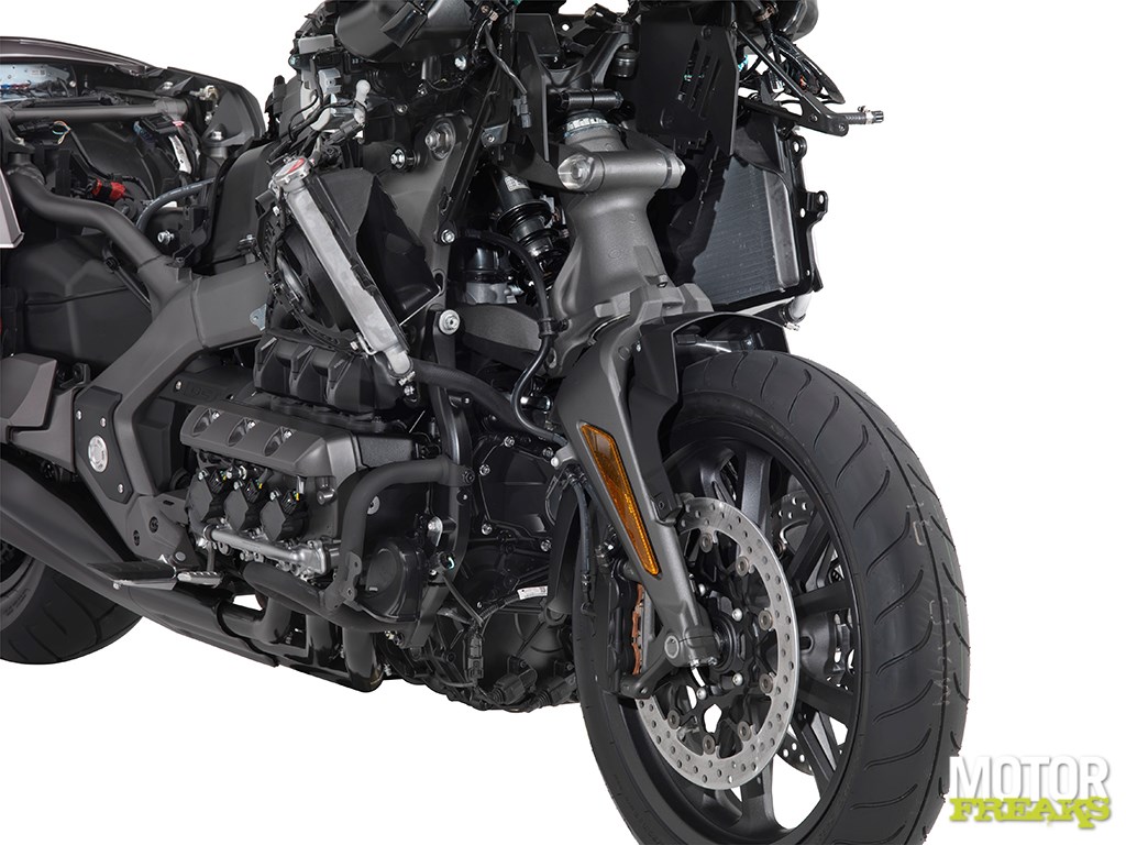Misschien iets minder opvallend – behalve dan de nieuwe FIOR-type voorvork, maar minstens zo belangrijk is het compleet nieuwe rijwielgedeelte dat Honda voor de 2018 Gold Wing heeft bedacht. Volgens Honda is alleen al hiermee 48 kilo aan gewicht bespaard en dat is toch een flinke boel. Het blok is nu 40 mm verder naar voren geplaatst en ook rijder en passagier zitten nu 36 mm meer naar voren. Dankzij de nieuwe FIOR-type voorvork zit bij volledige belasting het voorwiel nu 24 mm verder naar voren, waardoor de ruimte is ontstaan om onder andere het blok naar voren te plaatsen. Een ander voordeel is de verminderde wrijving en het scheiden van veer- en rembeweging, waardoor de remmen nu geen invloed meer hebben op de veerbeweging.