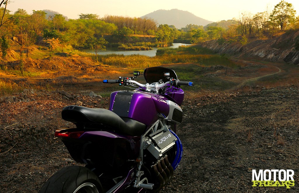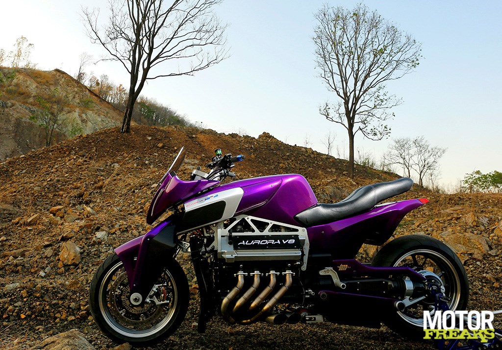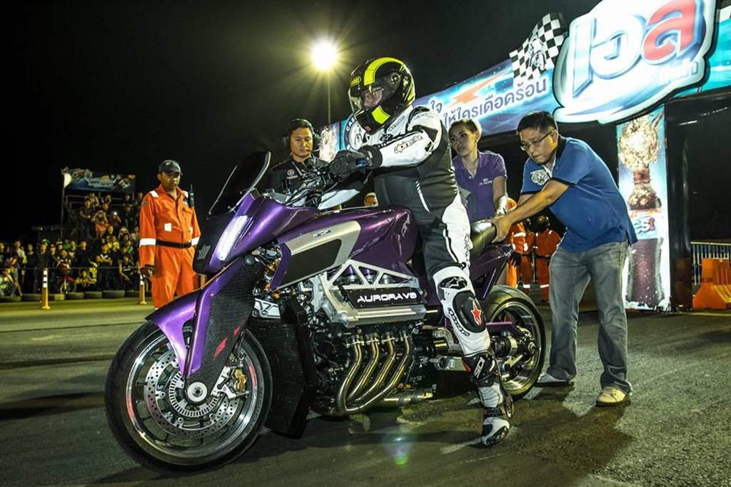 Terug in Bangkok werd de motor voor het eerst op de dyno gezet. Sinds die tijd hebben Messina en z’n mannen (en ook vrouwen) gewerkt aan het pre-productiemodel van de fiets, waarvan de cilinderinhoud op 2.575cc is gezet door de boring en slag van de originele 80 graden V8 op 86 x 55,4 mm te zetten. Daarmee is het niet langer de dubbele Kawasaki ZX-12R dat het oorspronkelijke 2.398cc debuut was, maar is voortgeborduurd op de ervaring die Vincent heeft met big-bore Kawasaki’s. En daar is het niet bij gebleven. “We hadden een interessant gesprek in Milaan met een journalist die erop stond met de motor naar een circuit te gaan,” zegt hij, “daar werd ik zenuwachtig van, want hoewel hij op straat net zo goed was als mijn Diavel, dacht ik niet dat de Aurora klaar was voor het circuit. Dus zijn we terug naar de tekentafel gegaan en hebben naar de grondspeling gekeken. We verplaatsten de dynamo van de linkerkant naar tussen de cilinderbanken, gebruikten een smallere waterpomp, veranderden nog een paar dingen en hebben een speciale uitlaat gemaakt, wat ons een hellingshoek van 55°