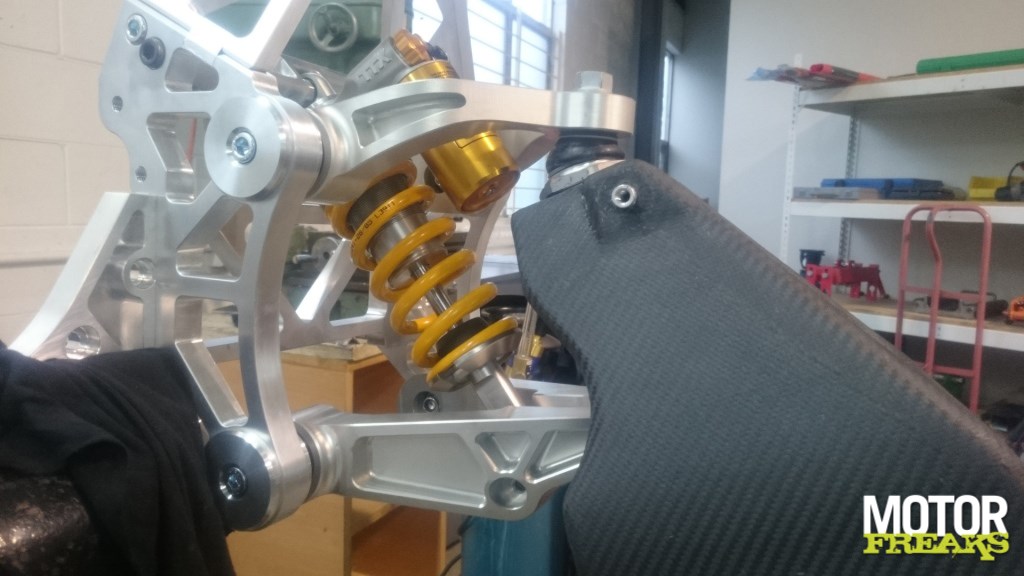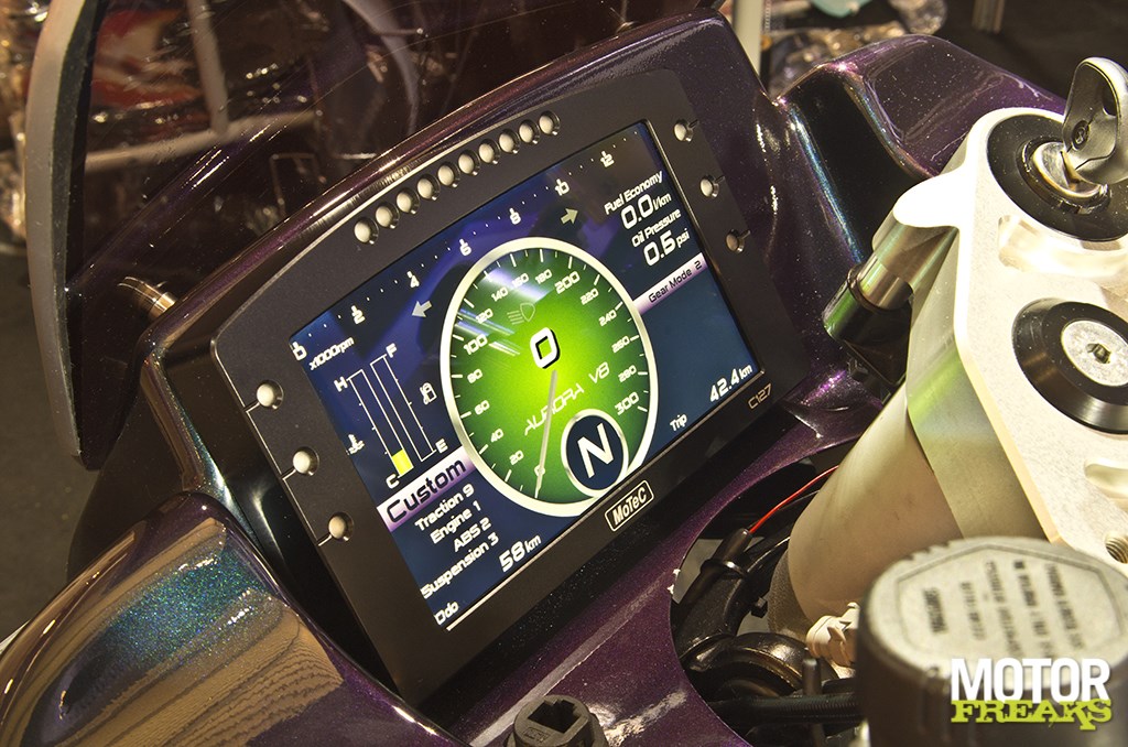 Foir type voorvork om de motor zo compact mogelijk te maken. MoTeC display is cooool