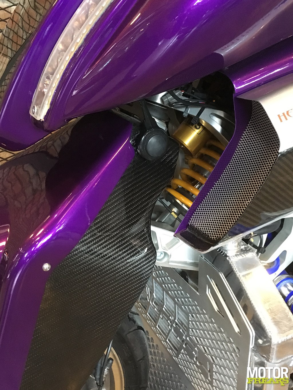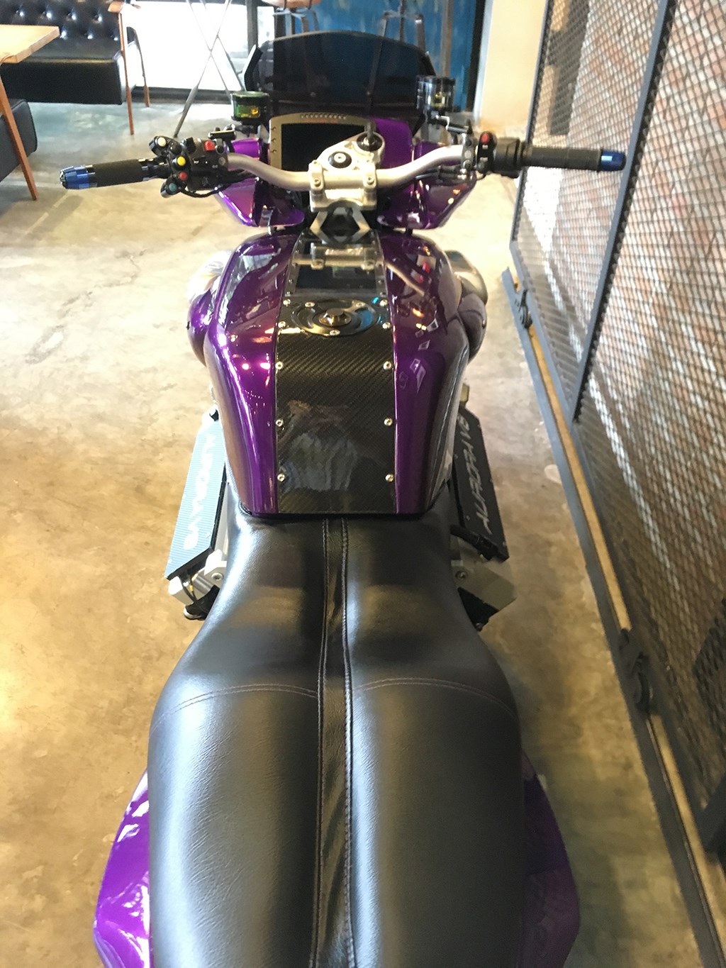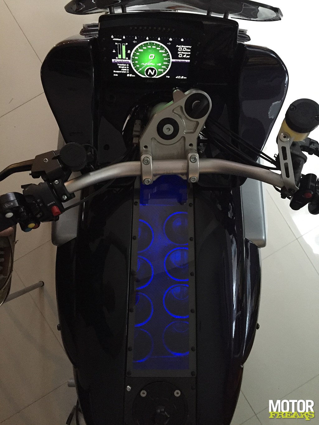 Als je 'm dan toch in Thailand hebt gemaakt...servomotoren met ride-by-wire techniek. Bovendien kun je ze volledig in werking zien, onder de verlichtte perplex motorsluier die als benzinetank dient en 22 liter inhoud heeft en achter de luchtinlaat onder het zadel doorloopt. “Ik wilde altijd al doen wat ze in de jaren ’60 deden met Ferrari F1 auto’s en Endurance racers,” zegt Vincent. “Zij hadden een doorzichtig paneel in de achterste sectie waardoor je naar de inlaatkelken kon kijken en de gaskleppen in werking kon zien terwijl ze in de paddock werden opgewarmd. Ik dacht dat het geweldig zou zijn wanneer mensen datzelfde bij mijn motor zouden kunnen zien.”